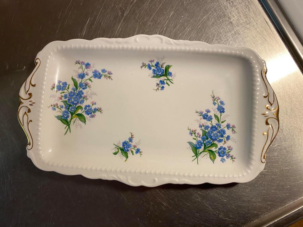 Sigbritt sa till mig att tänka mig för och inte lämna bort för mycket. Det är just vad jag gör. Jag tänker mig för och packar ner en massa grejer som jag ska ha med mig hem till Jönköping. Jag är numera riktigt förtjust i dessa tre kakfat. Det första föreställer blomman förgätmigej, så gulligt fat!
