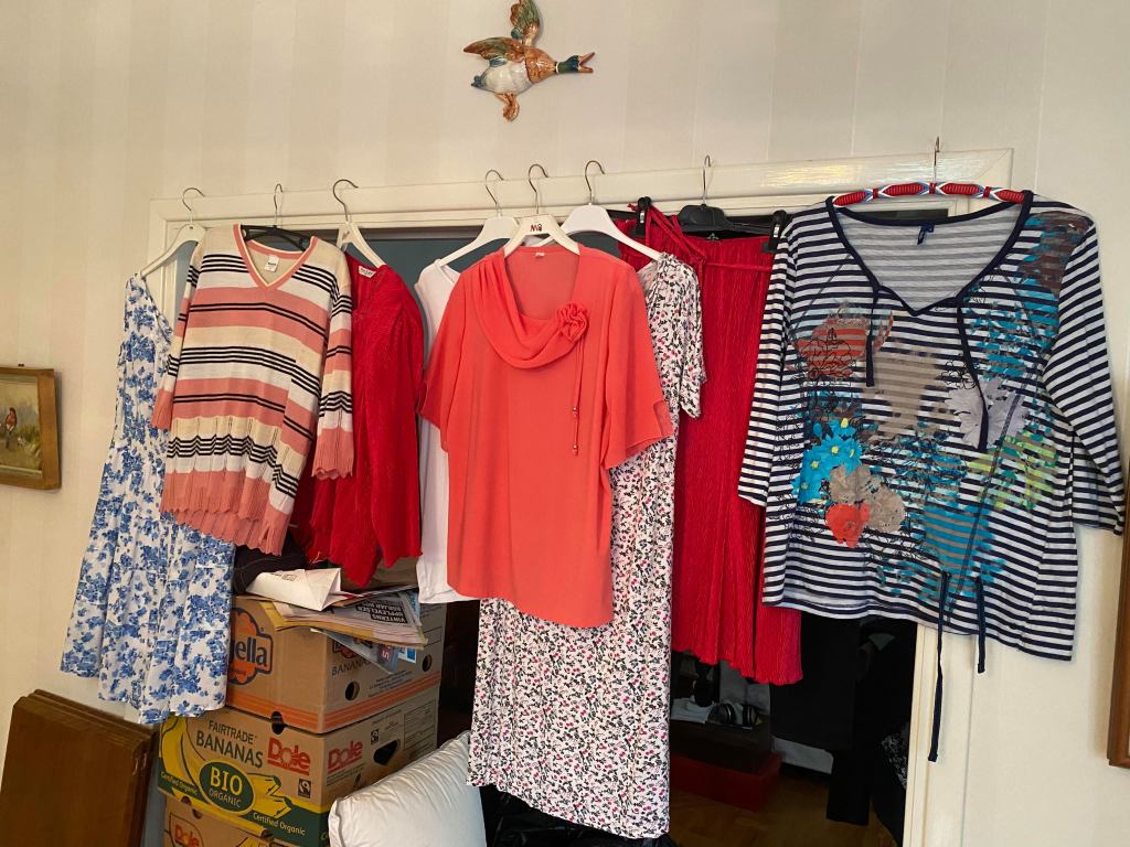 Jag bjuder in Inga och Sigbritt varje kväll för att titta på dagens kollektion. De får ta vad de vill och det som blir över skänker vi till Ria. Det är så roligt att mammas kläder och saker lever vidare. Sigbritt är så fin i en tröja hon valde häromkvällen.