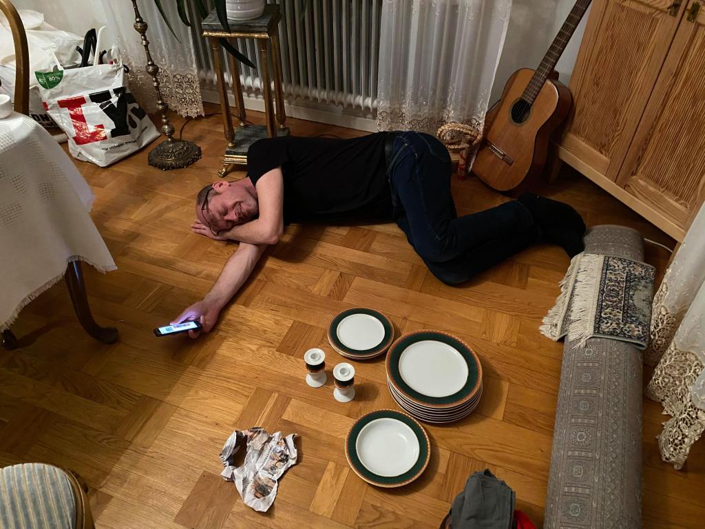 Framåt kvällen var min käre bror trött. Här har han just fotograferat en servis med tallrikar. Han gör det bra. Han är riktigt effektiv.