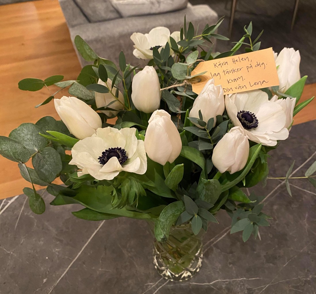 Det känns så fint att sitta och titta på denna vackra bukett mitt i denna svåra stund. Det lättar upp.