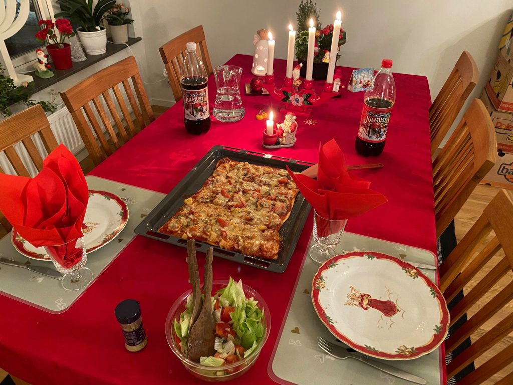 Jag gjorde pizza med sallad och Hans köpte semlor. Vi har haft en lugn och trevlig kväll med mycket prat.