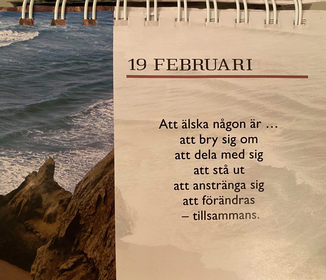 Jag fastnade för orden att stå ut. Ibland är det inte lätt med relationer men man får helt enkelt lära sig att stå ut, man får träna sig i detta. Jag tycker också det är fint att man kan få förändras tillsammans. Allt verkligt liv är förändring. Förändring är det enda som är konstant. Att få förändras tillsammans är spännande men det är viktigt att båda vill. Det händer mycket med oss i förändringprocessen.