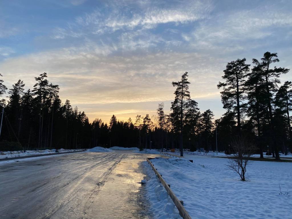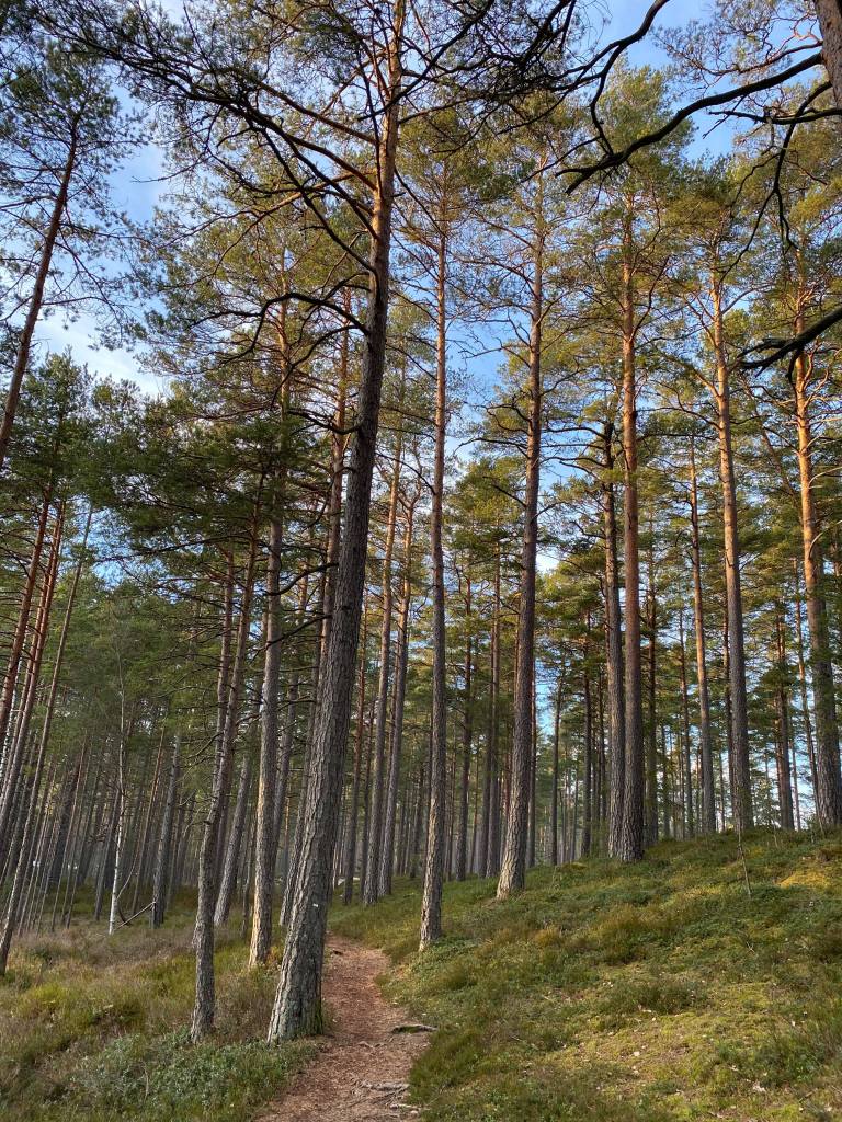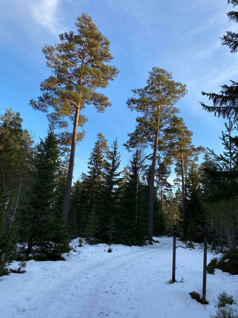 Vi vandrade på stigar invid grön mark bland tallar och på snöiga vägar bland tallar.