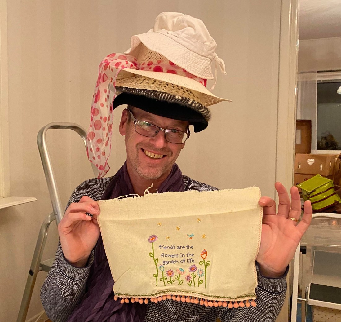 Nu är Hans och Anita här och vi har sorterat och delat upp lakan, handdukar, garn m m. Hans livade upp oss genom att ta på sig några av mammas hattar. Ja, vad gör man inte för att lätta upp stämningen mitt i allt arbete?