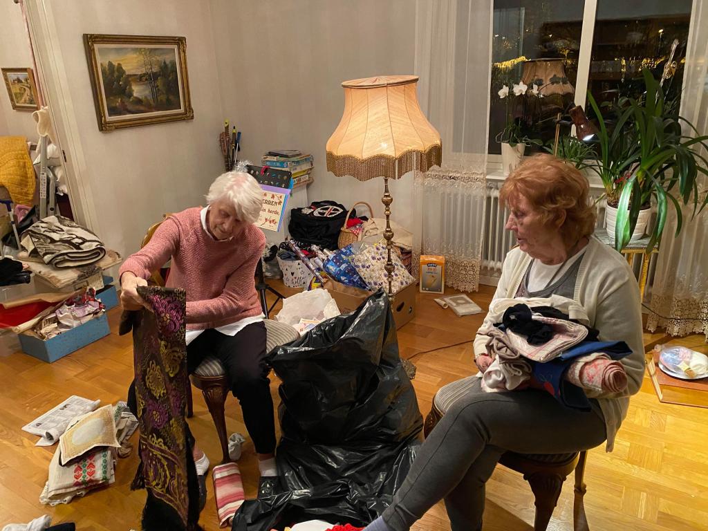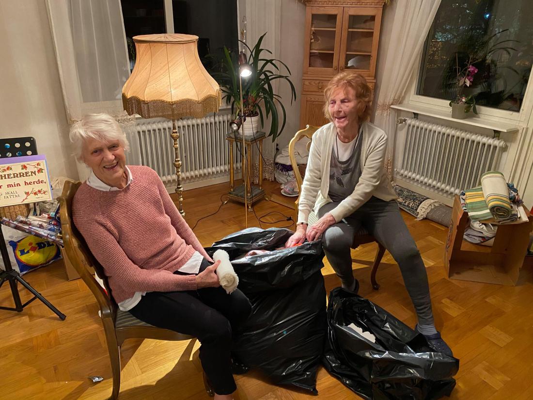 Jag har gått igenom mammas alla dukar och löpare och det jag inte vill ha kommer att skänkas. Jag har lagt det i en säck som nu är överfull. Ikväll kom Inga och Sigbritt in för att välja vad de ville ha. Det blev en jätterolig stund. Medan de satt och gick igenom hela säcken rensade jag fler hyllor och sorterade det som skulle till textilåtervinning, skänkas eller packas för att följa med till Jönköping. På bilden nedan har Sigbritt hittat en duk el skynke som kommer från mormor och morfars hem. Hon kände igen själva stilen. Det dök upp så många härliga minnen. Både Inga Sigbritt hittade en hel del som de ville ha, jätteroligt! Vi har haft det riktigt tokroligt ikväll och skrattat massor. Så skönt för själen!
