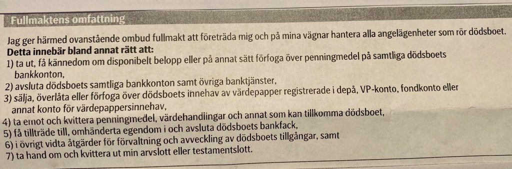 Förra torsdagen var jag med om en tråkig upplevelse som stal energi från mig. Eftersom det fanns några saftiga fakturor (begravningsbyrån, minnesstunden, gravstenen…ja, ni vet…) att betala efter mammas död så hade min bror och jag bestämt att vi skulle sälja hennes fonder. Vi hade fått veta att banken kunde hjälpa oss med att betala räkningarna men då behövde tillräckligt med pengar finnas på ett vanligt konto. Jag hade pratat med den trevliga och tillmötesgående personalen på SEB, Skandinaviska Enskilda Banken, i Kalmar som jag haft kontakt med tidigare gällande mammas bankärenden. De sa att jag behövde infinna mig fysiskt på ett bankkontor och ha med Dödsfallsintyg med släktutredning och Fullmakt Dödsbo, SEB:s egen fullmakt. Vi ordnade detta. Min bror hade fyllt i en fullmakt och den var bevittnad av två personer. Allt var i sin ordning. Jag åkte iväg till SEB här i Jönköping och trodde jag skulle få hjälp med mitt ärende. Killen i kassan nekade mig att göra detta. Han sa att jag behövde ha bouppteckningen med mig för att kunna sälja fonder. Han ville också veta vilka som var arvtagare. Jag visade honom att detta stod i släktutredningen men det verkade som att han inte förstod. I släktutredningen fanns pappa som var avliden, vår bror Tomas som var avliden och så min bror Hans och jag. Jag informerade honom om vad personalen på SEB i Kalmar sagt och att vi behövde sälja fonder för att kunna betala räkningar. Han nekade mig att göra detta. Det spelade ingen roll vad jag sa. Han var ett riktigt stenansikte. I Fullmaktens omfattning (se nedan) står det tydligt vad man får göra. Punkt 3: sälja, överlåta eller förfoga över dödsboets innehav av värdepapper registrerade i depå, VP-konto, fondkonto eller annat konto för värdepappersinnehav.