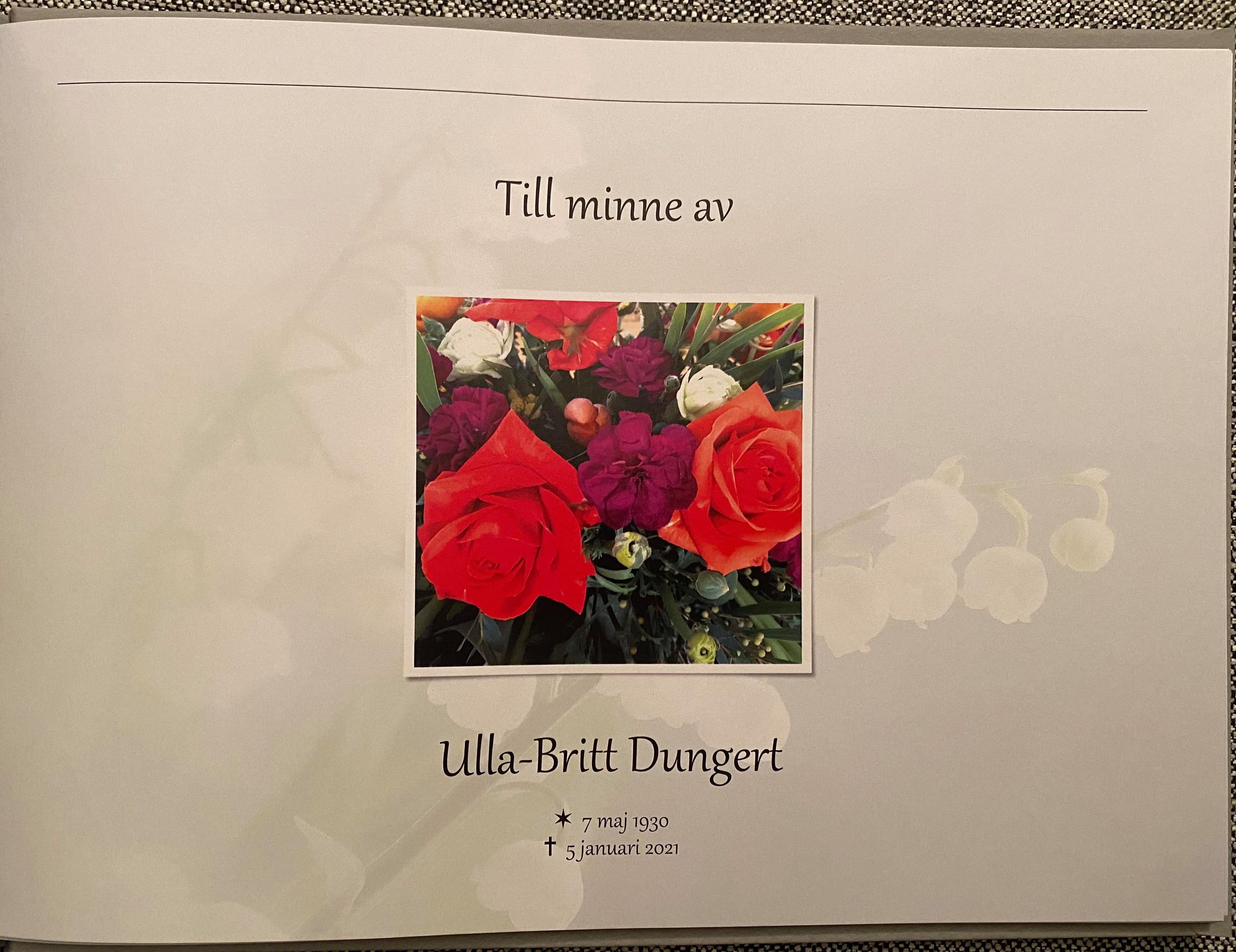 Begravningsbyrån har gjort en minnesbok från mammas begravning. Den är verkligen fin. Jag fastnade för en dikt. Tårarna rinner när jag läser den. Den lyder som följer: