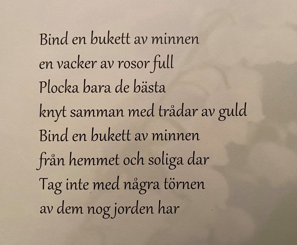 Bind en bukett av minnen, en vacker av rosor full. Plocka bara de bästa, knyt samman med trådar av guld. Bind en bukett av minnen från hemmet och soliga dar. Tag inte med några törnen, av dem nog jorden har.