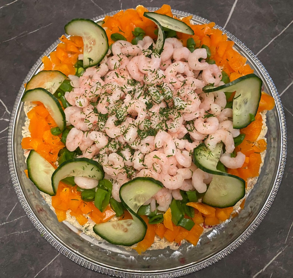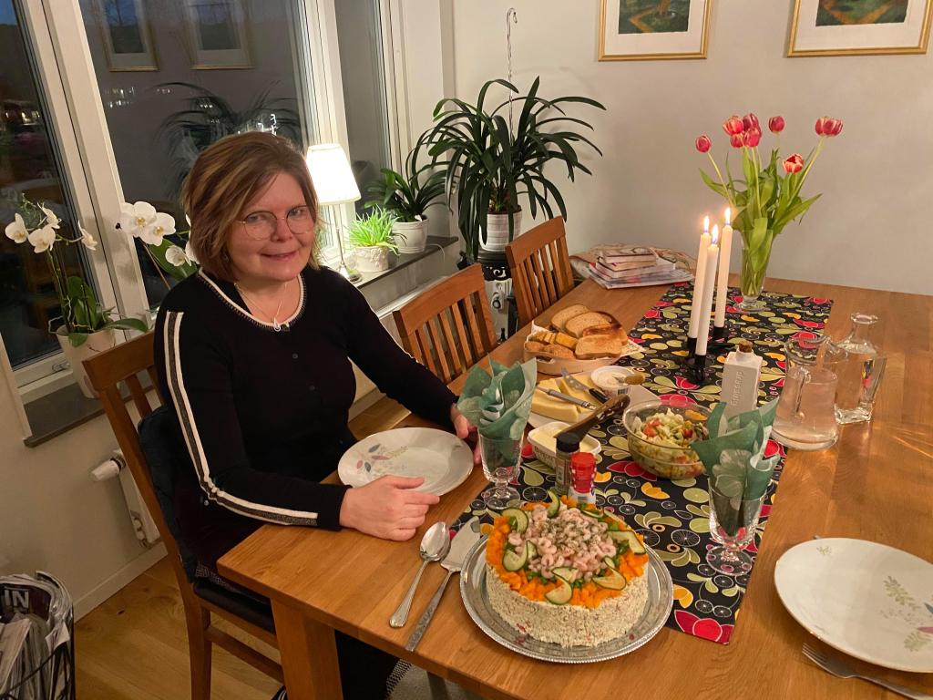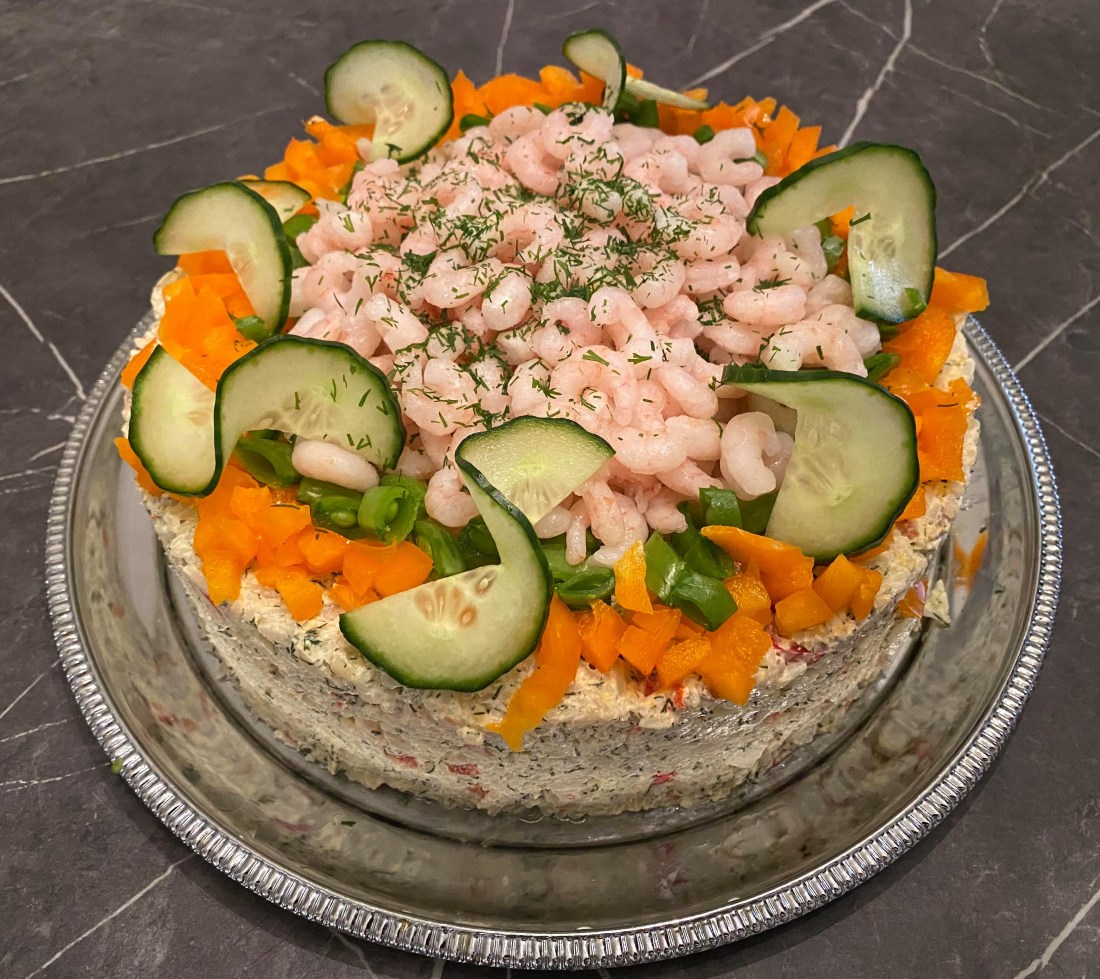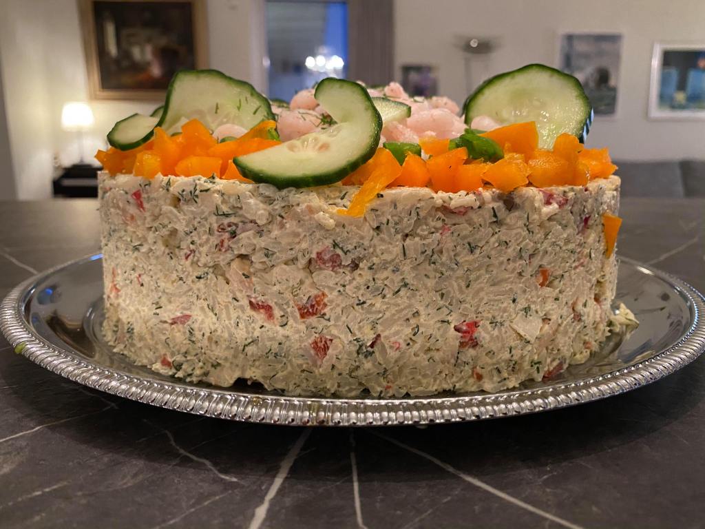 Min goda vän Helena skulle komma hit ikväll och jag ville göra en ny maträtt. Jag googlade efter något recept med räkor och hittade Risrand med räkor. Det ser ut som en smörgåstårta men basen består av ris. Igår förberedde jag det mesta och ikväll har jag garnerat rätten. Det ser väldigt fräscht ut, tycker jag. Det var gott men inte det godaste jag smakat. Jag ger rätten betyg 3,7 av 5. Jag serverade vanlig grönsallad till samt bröd, kex och ost. Det går att variera receptet på olika sätt och om jag gör det igen ska jag nog ta lite mer fiskbuljong, kanske ytterligare en lök och någon mer krydda. Jag minskade på grädden och majonnäsen och tog 1 dl crème fraiche istället. Receptet hittar du här: https://recept999.se/r/1170267/risrand_med_r_%A4kor/