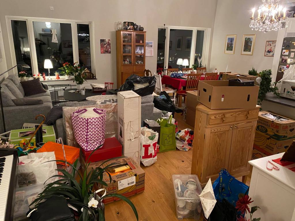 När Hans och jag kom hem till Jönköping och allt var inburet såg det ut som på bilden nedan. Det får gärna vara lite stökigt. Jag är så otroligt glad och lättad att allt är klart och att mammas lägenhet är tom. För min del har det varit viktigt att få ta med mig en hel del saker hem. Det är bättre att ta för mycket och rensa sen än att inte ta så mycket och sen ångra sig. Nu har jag gott om tid på mig att gå igenom allt, rensa lite till, sortera och lägga varje sak på lämplig plats. Så härligt att få väva in gamla saker med historia tillsammans med det som finns i vårt hem. Jag känner mig tillfreds och tacksam.