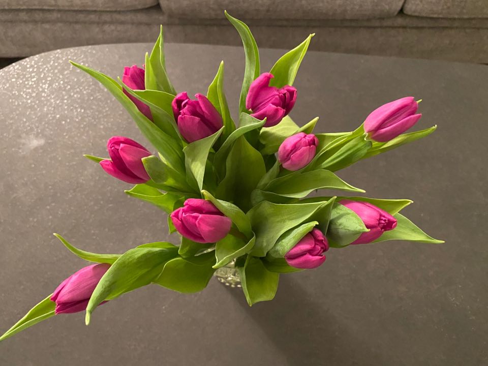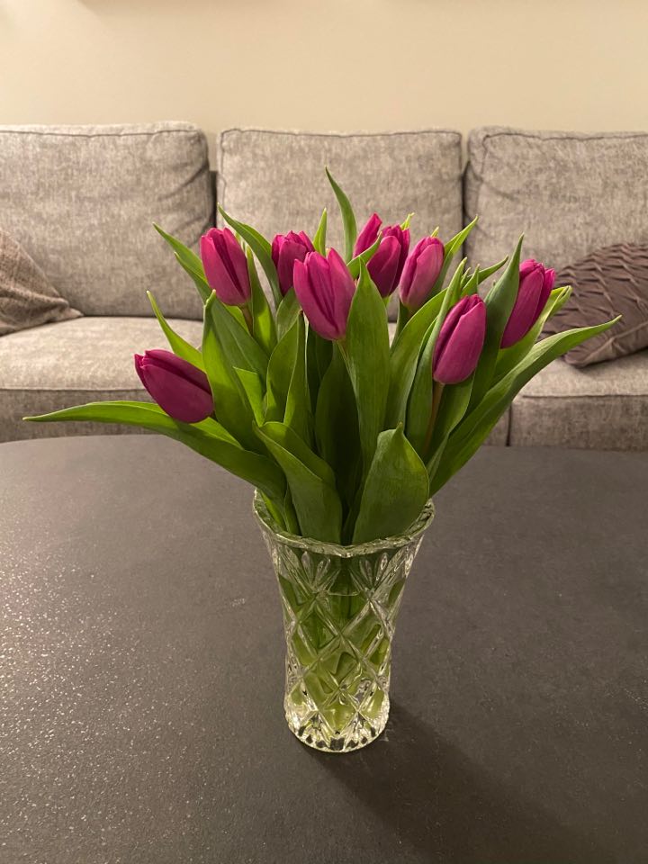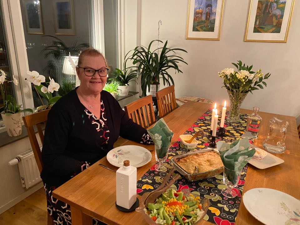 Ikväll har min goda vän Yvonne varit här. Jag hade fixat kycklingpaj och sallad som vi avnjöt. Vi hade mycket att prata om som alltid. Senare blev det kaffe med dopp. Hon hade med vackra lila tulpaner. Jag älskar blommor.