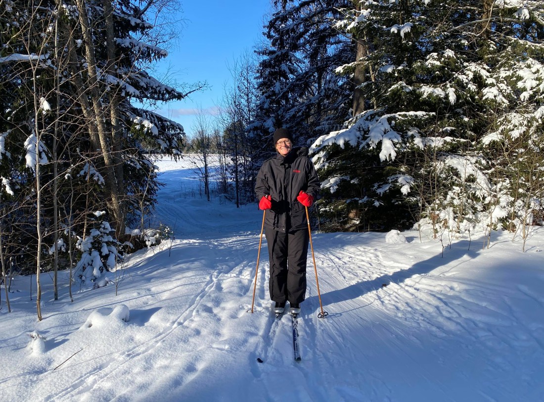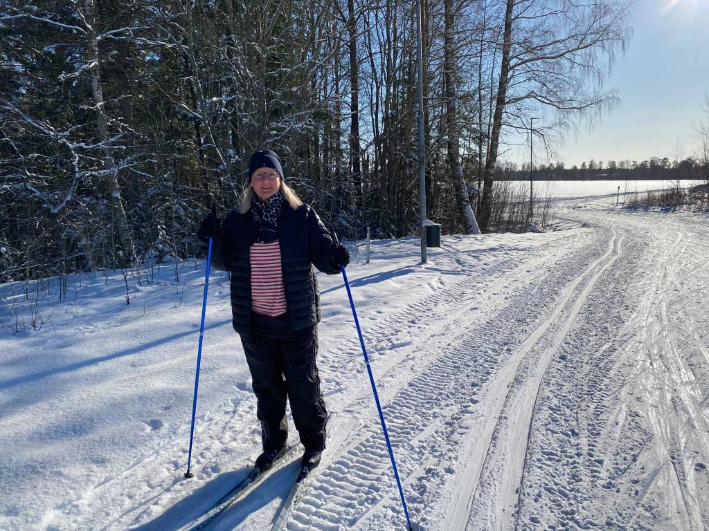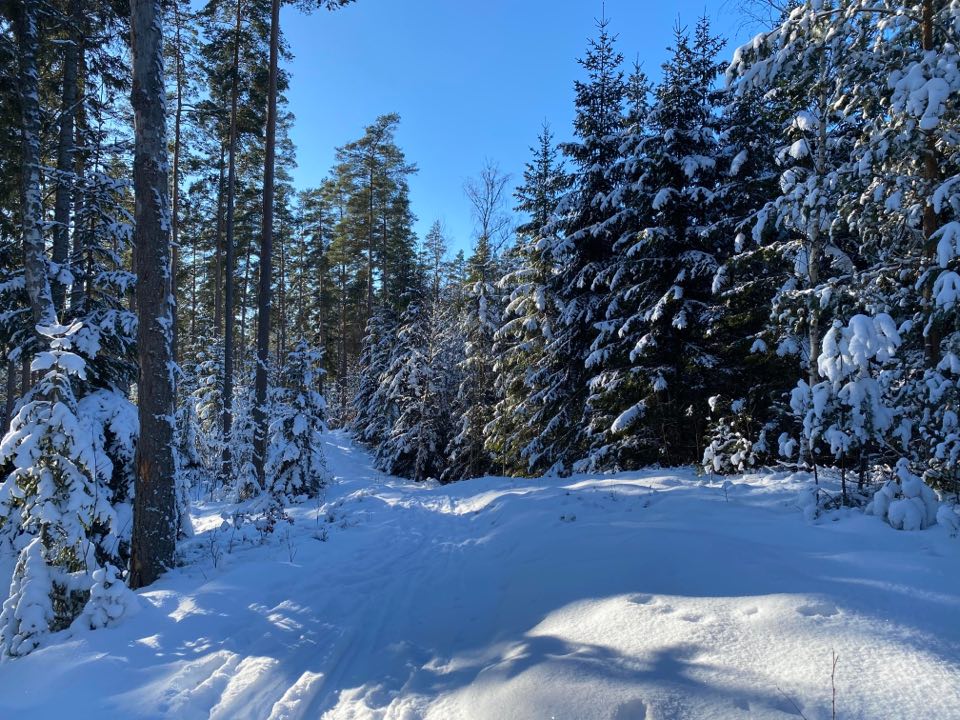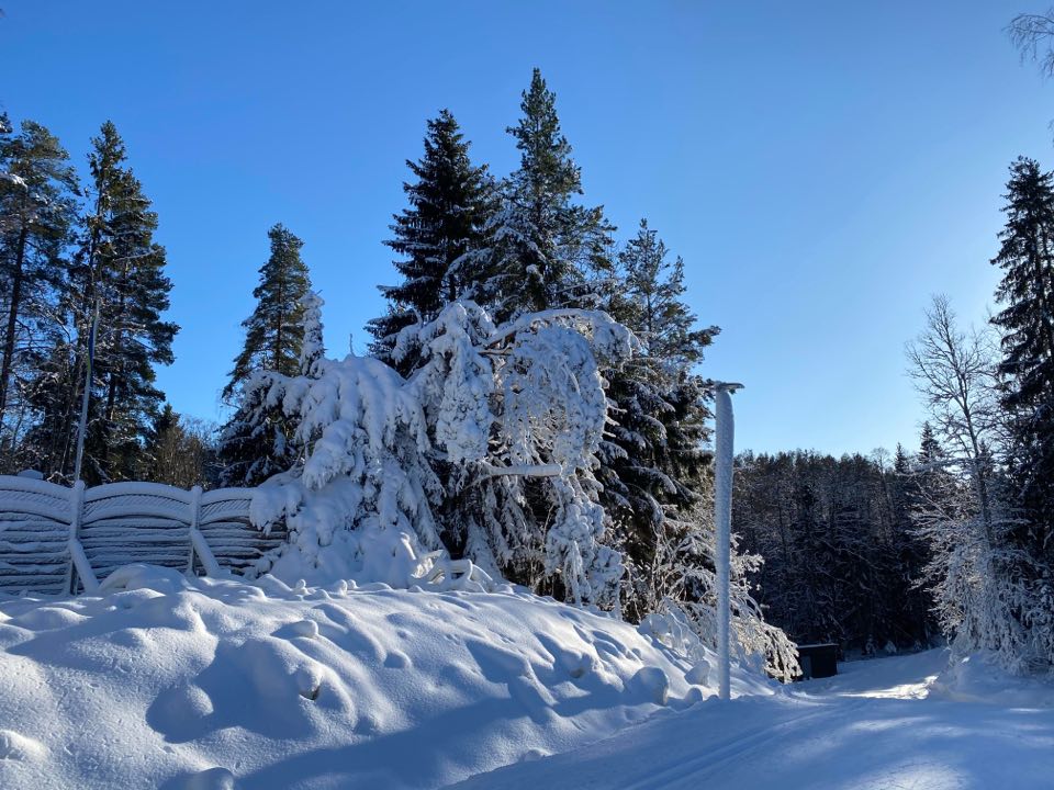 Oh, vad jag har längtat efter detta! Det är ca 3-4 år sen jag åkte senast. Vi blev rekommenderade att följa grön markering som skulle vara ett spår utan branta backar. Vi satsade på det men det slutade med att vi kom på ett sidospår som ledde rakt ut i skogen. Många vurpor blev det för det gick så fort (tyckte vi) när vi åkte nerför och träden var nära inpå. Oj, vad det var bra glid! Till slut fick vi vända för den gröna markeringen ledde oss verkligen ”åt skogen” i dubbel bemärkelse. Det var en jobbig terräng men vi kom nära naturen och motion fick vi. Vi kom sen ut där det var preparerat och det kändes tryggt.