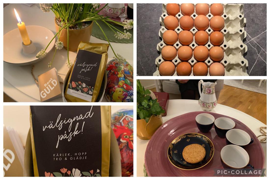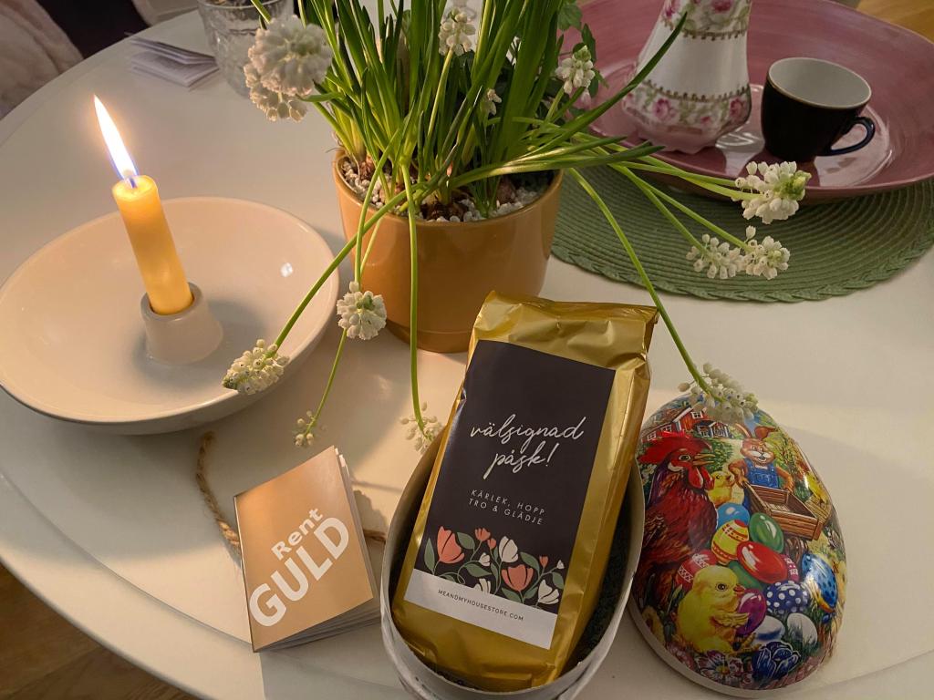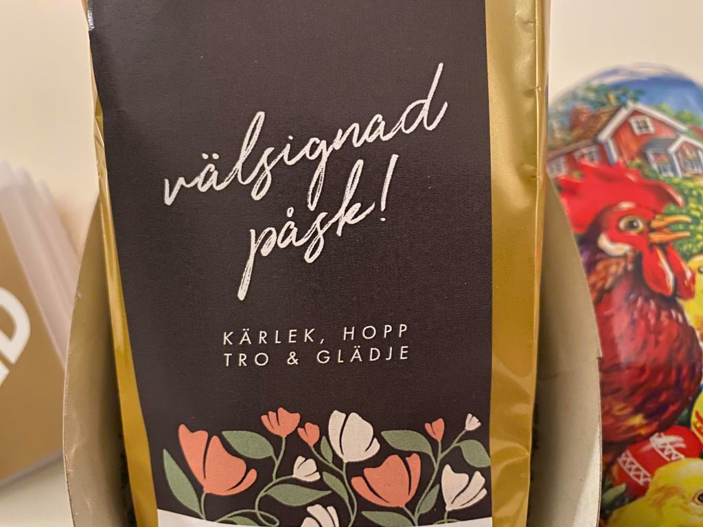 Kicki ledde nattvarden men först ville hon ge oss varsin present. Hon hade med varsitt påskägg till oss. Jag blev förstås glad men tänkte i mitt stilla sinne att ett påskägg fullt med godis inte är bra för mig. Jag äter för mycket helt enkelt. Till våra stora glädje var det något annat i påskägget, en påse te med Södermalmsblandning. Jag gillar te så det var en perfekt present. Jag blev glad bara av att se förpackningen där vi önskades välsignad påsk med kärlek, hopp, tro & glädje. Jag tror att dessa positiva affirmationer betyder något i våra liv.