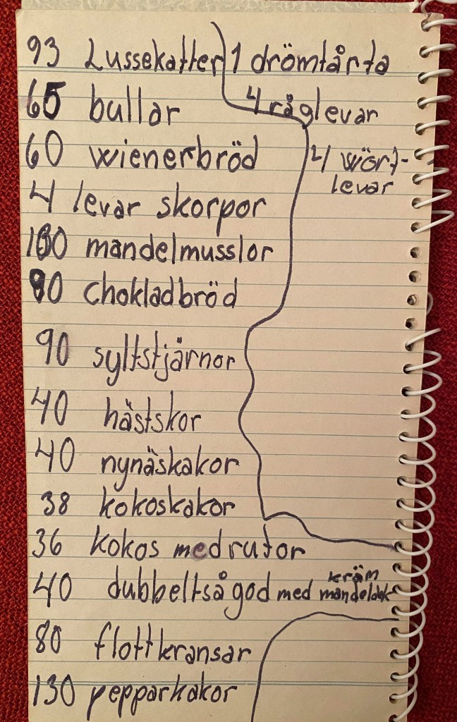 Det är din födelsedag. Du skulle ha fyllt 91 år idag den 7 maj. För ett år sen firade vi din 90-årsdag men i januari flyttade du till ditt himmelska hem. Du älskade att baka kakor, laga mat och ha kalas. Just igår kväll när jag gick igenom några skåp hittade jag detta block. Jag minns så väl när jag skrev det, någon gång på 70-talet tror jag det var. Du låg i sängen och jag halvlåg bredvid och skrev upp alla kaksorter du dittills hade bakat inför den stundande julen. Idag vill jag hylla dig genom att ta fram dessa härliga minnen. Jag är tacksam för att du skapade ett så öppet hem dit alla var välkomna. Många kakor har det blivit genom åren. ![]()