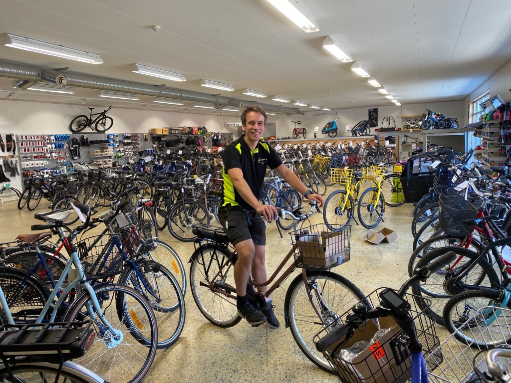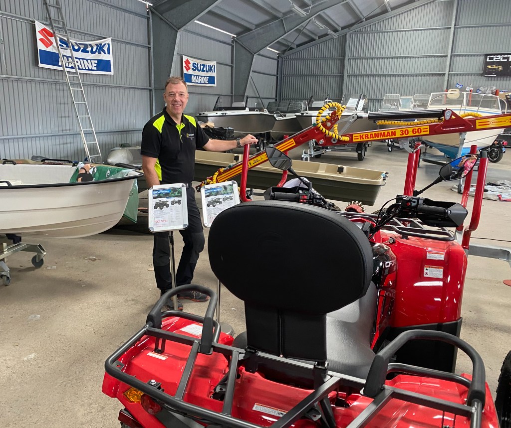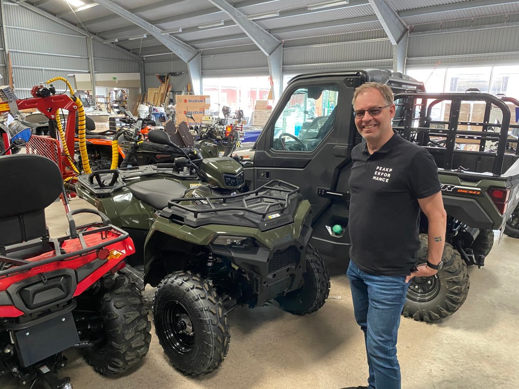 VD Sven Johansson och ekonomichef Magnus Schiller visade oss runt i och utanför lokalerna. Här finner vi en massa olika produkter: Automowers, gräsklippare, motorsågar, ATV (All Terrain Vehicle) som i Sverige kallas fyrhjuling eller terränghjuling, båtar, båtmotorer, släpvagnar, cyklar, lantbruksmaskiner, skogsmaskiner, Murikka stekhällar och mycket annat.