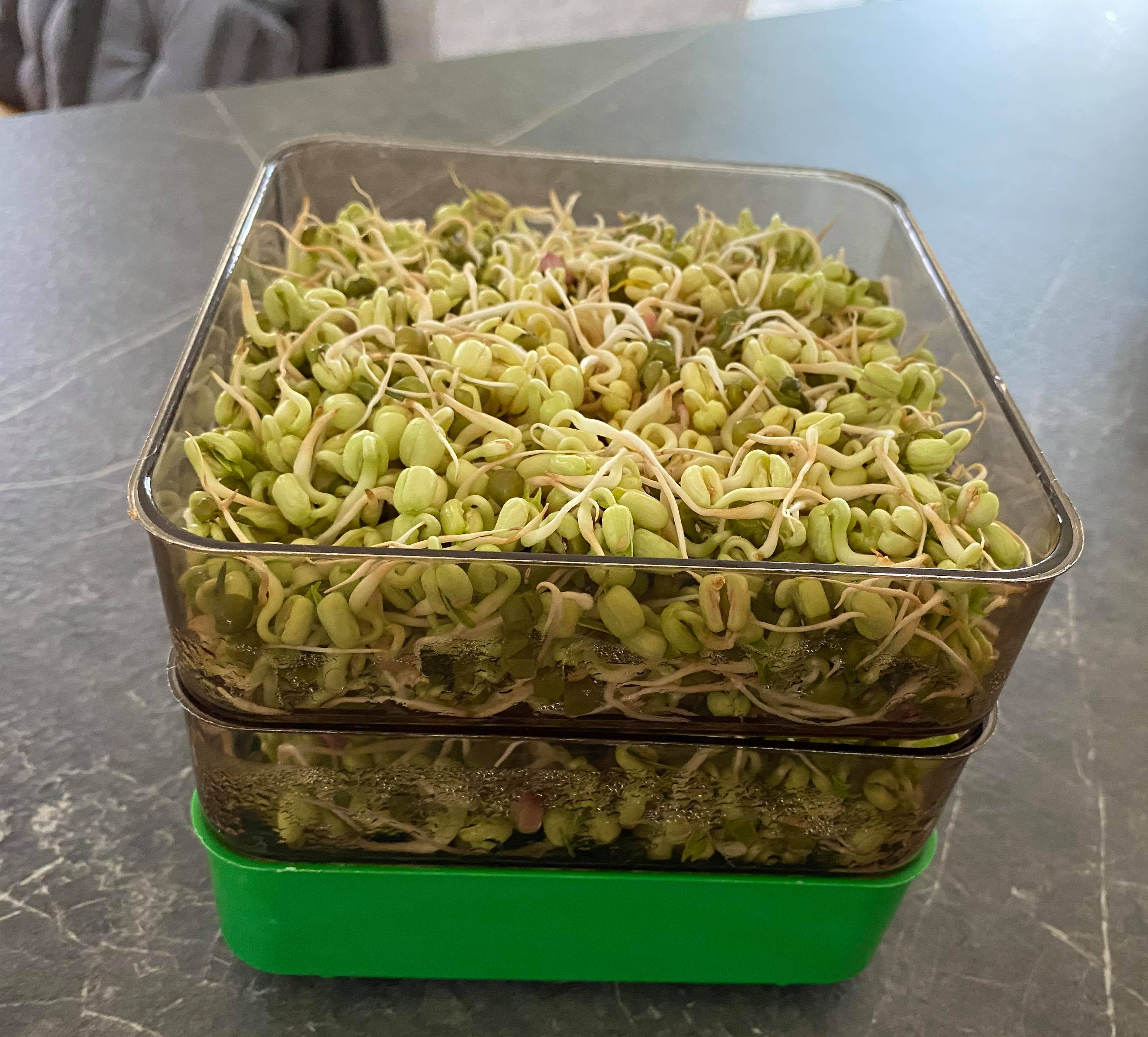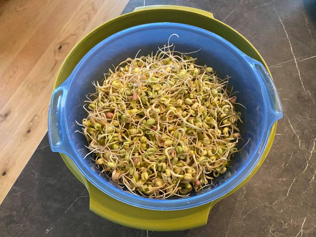Jag har sköljt bönorna 1-2 gånger per dag. Ikväll tyckte jag att det var dags att skörda. Det har nu gått tre dygn sen jag lade dem i blöt.