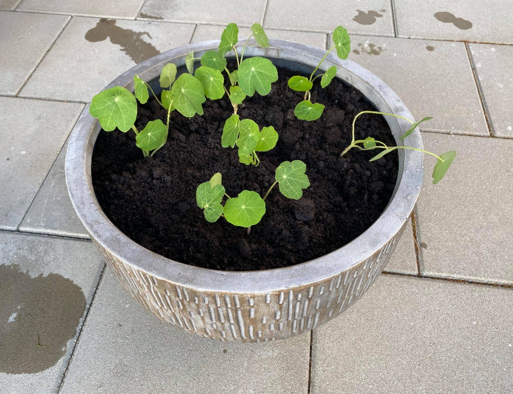 Jag har också planterat om mina krasse. Jag köpte en ny grå stor kruka som jag har planterat de flesta i. Några stycken planterade jag i en kruka som jag fick med från mammas hem. Det blev så bra och jag längtar efter att de orangea blommorna ska dyka upp. Detta ger mig en sådan härlig känsla inombords.