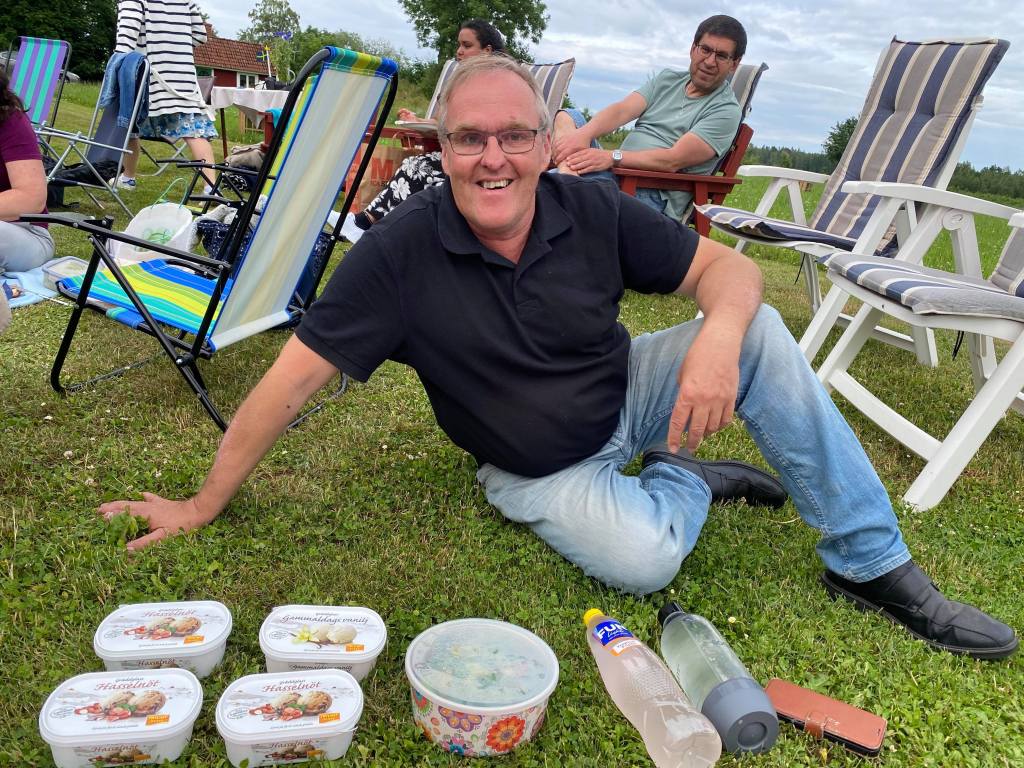 Var och en hade med sin grillning. Hans och jag hade bjudit med vår vän Erik så vi bjöd honom på mat. Här tog vi några roliga foton. Först ser Erik glasspaketen och tittar med förtjusning på läckerheterna: hasselnötsglass, gammaldags vanilj m.m. Vad kan det vara i burkarna? Sen upptäcker han böngroddar, morötter, sallad, fullkornscous m.m. Besvikelsen i ögonen syns. Ja, ja…lite arrangerat var det.