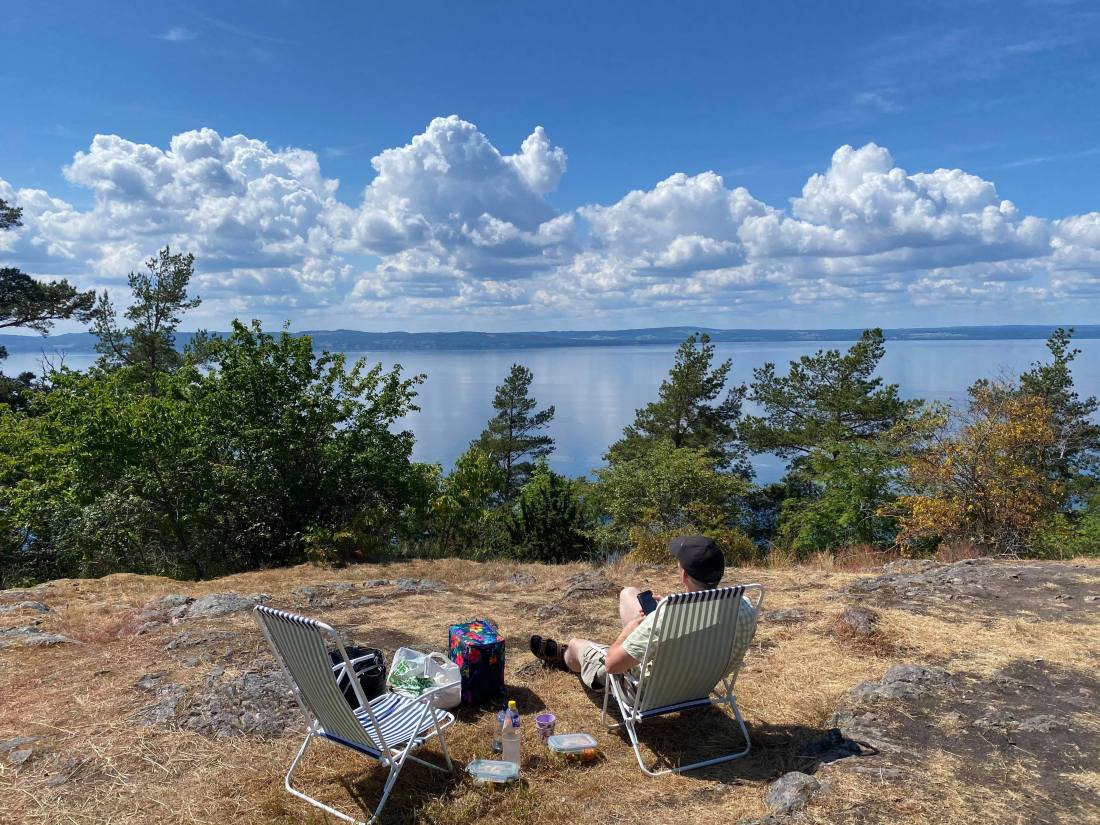 Vi hade med brassestolar och satt nedanför lusthuset med utsikt ut över Vättern som låg spegelblank. Vi åt rester från igår: potatis, sillröra, ägg, grönsallad och groddade mungbönor. Till efterrätt blev det jordbubbar, ananas och kaffe.