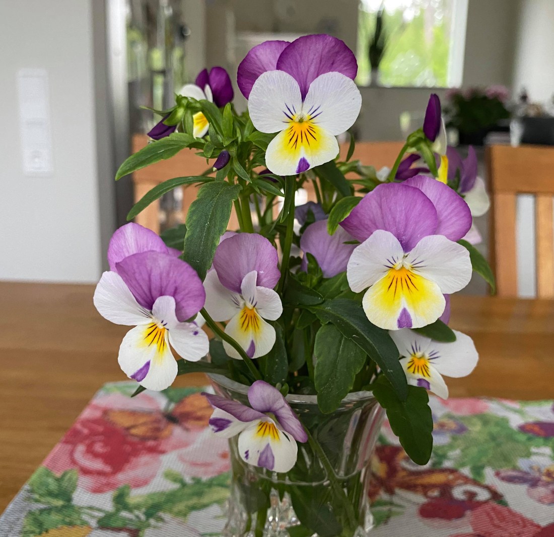 Det har blåst mycket här uppe på Tallkullen så en del stjälkar har gått av på mina penséer. Jag passade då på att göra en bukett att ha inne. Jag fascineras av hur vackra de är. De är riktiga mästerverk. Jag upphör aldrig att förundras över dem. De flesta penséer är färgstarka och jag älskar färg. Dessa är lite mildare men väldigt vackra. Blommor sprider verkligen glädje. Jag kallar det blomsterglädje.
