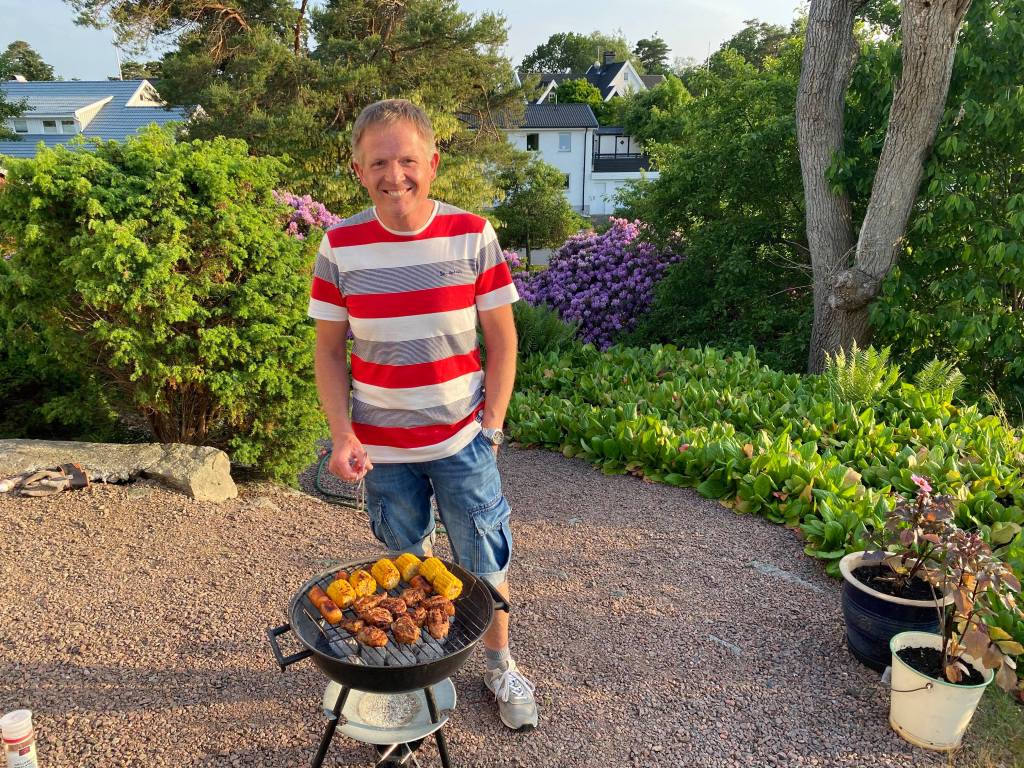 Sen blev det grillning. Bengt grillade kött, korv och majskolvar och Mia laddade upp med ugnsbakade nypotatisar, sallad och annat gott. Allt avslutades med kaffe och rabarberpaj.