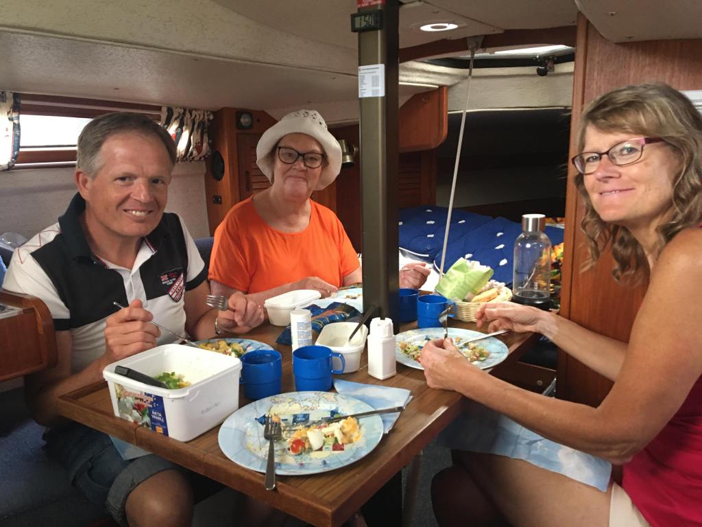 Vi hade tänkt äta lunch ute vid klippan men väderleksrapporten sa att det skulle bli starka vindar, regn och åska så vi åkte hemåt tidigare än beräknat och tur var det. Precis när vi kom in till bryggan började det regna och blåsa. Bengt och Mia fixade det som behövde göras för att båten skulle ligga stilla vid bryggan. Sen intog vi Mias goda kycklingsallad med dressing under det att det gungade en del. Vi slappade lite i båten tills det slutat regna. Sen cyklade vi hem till huset igen.