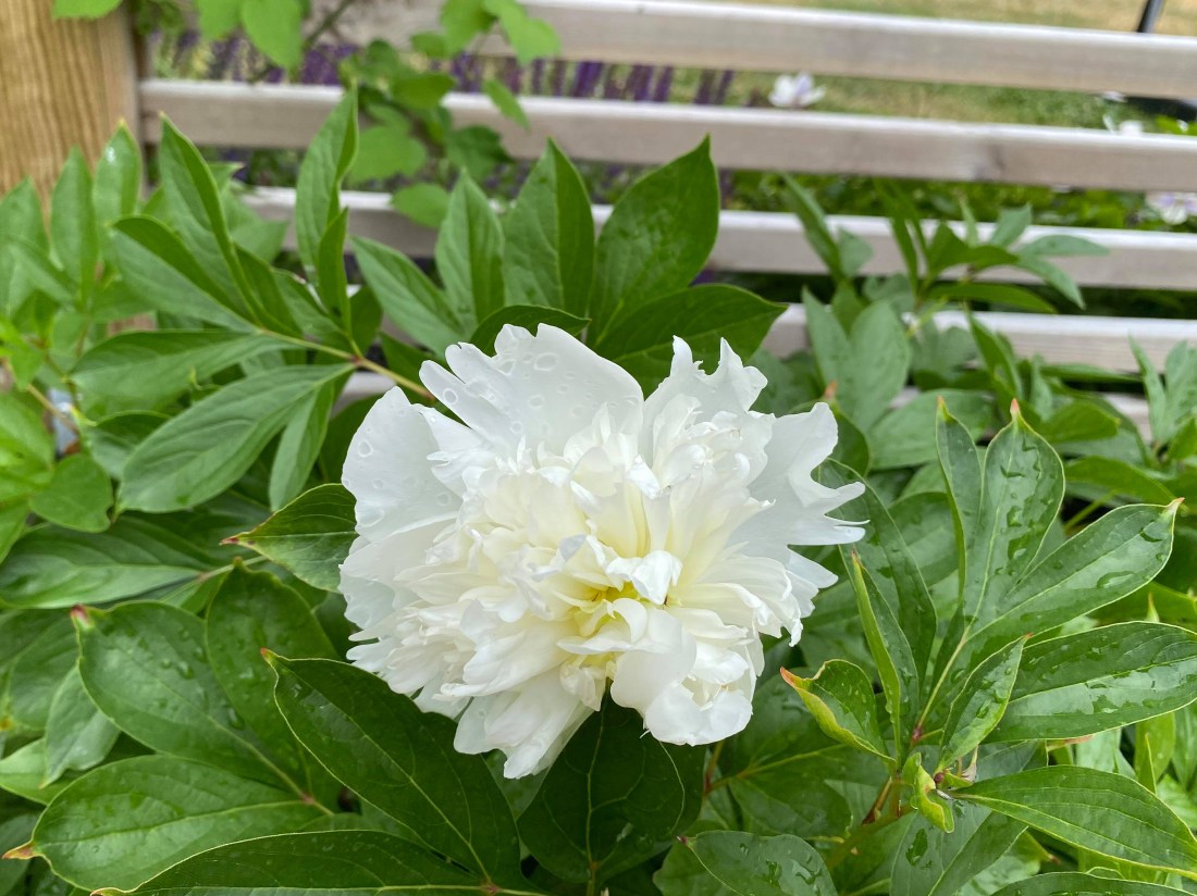 Jag är så glad att jag i alla fall har fått en pionblomma på den buske jag planterade förra våren. Förra året blev det 0 blommor så den procentuella ökningen är enorm. Det går inte ens att räkna ut.