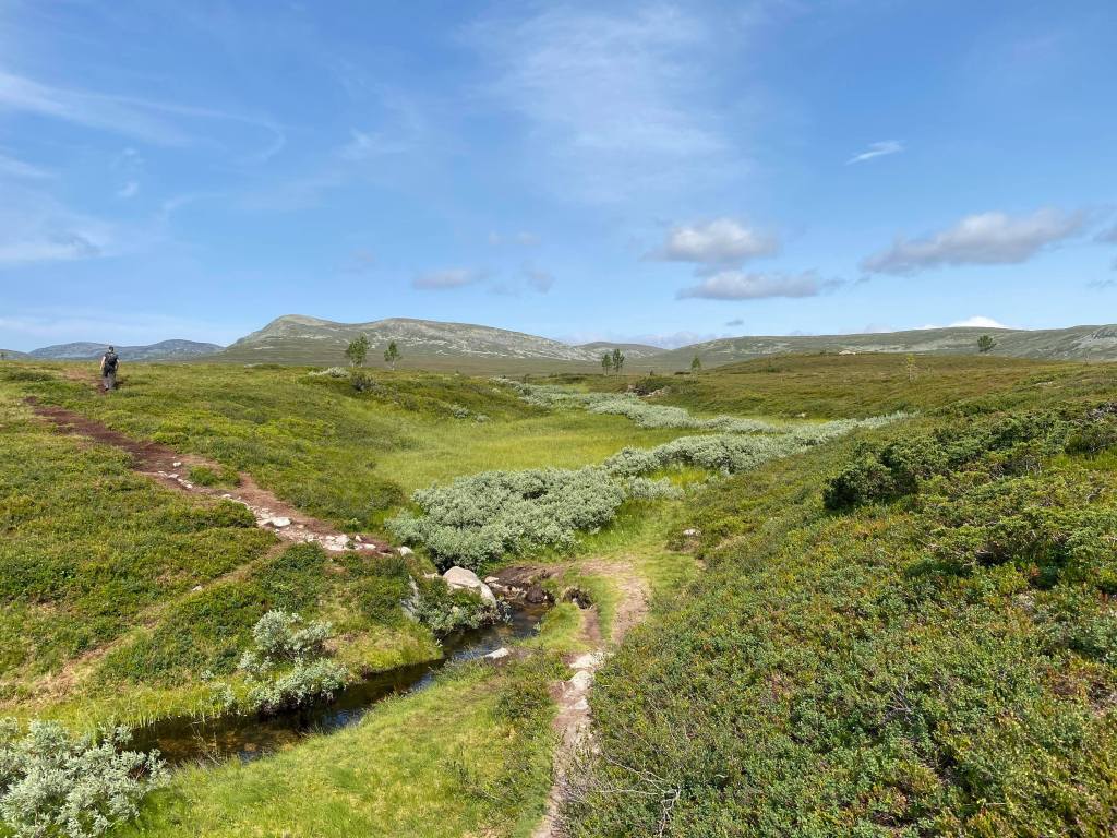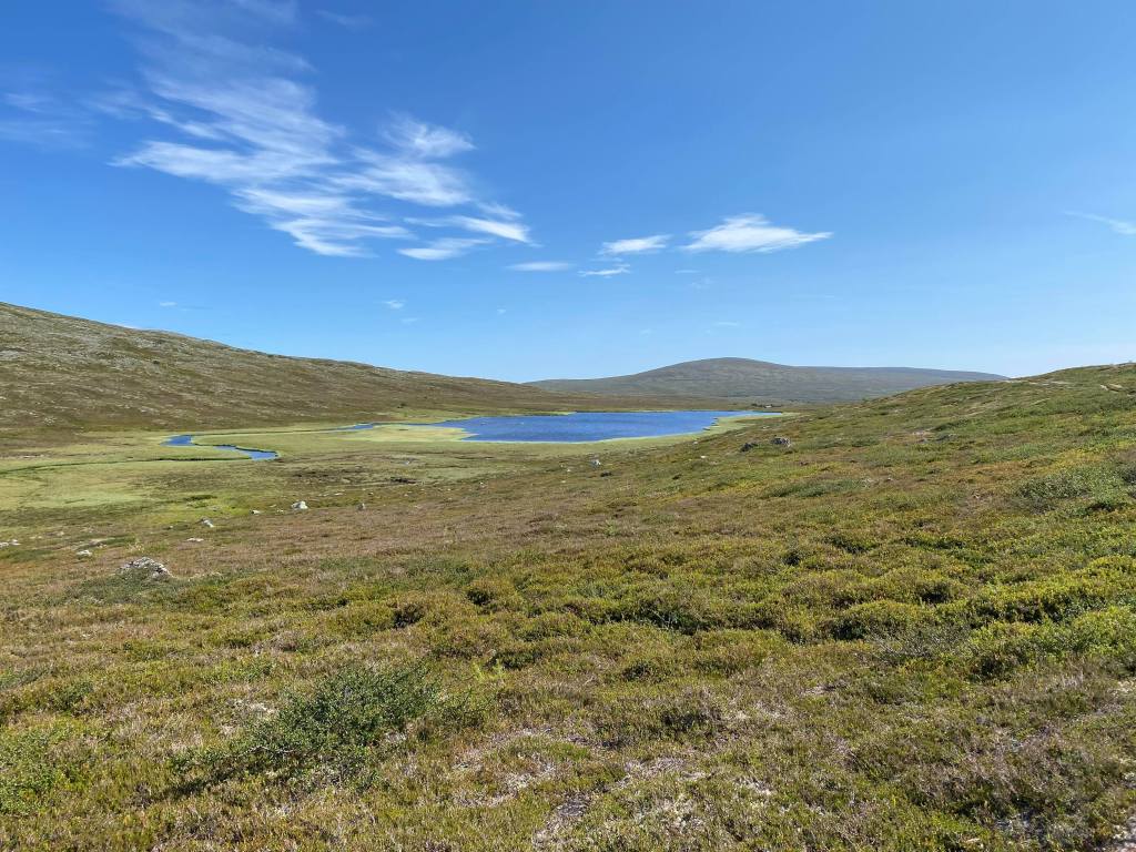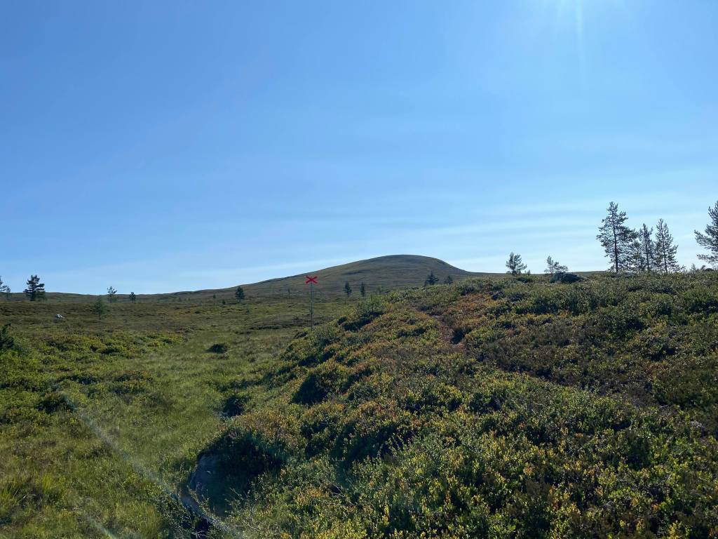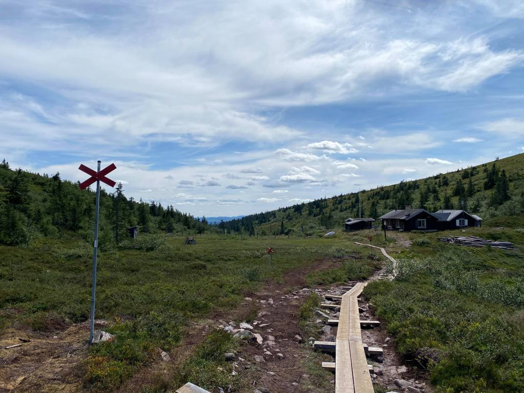 Nu närmar vi oss Närfjällsstugan. Du ser den en bit längre fram till vänster. Där vilade vi, åt vår matsäck och gick på dass. Härligt med vila och påfyllning av energi. Hjortron såg vi också men de var inte riktigt mogna.