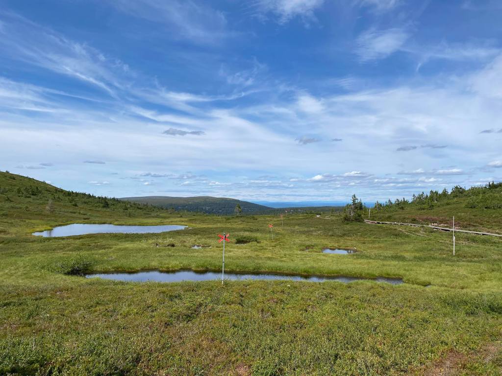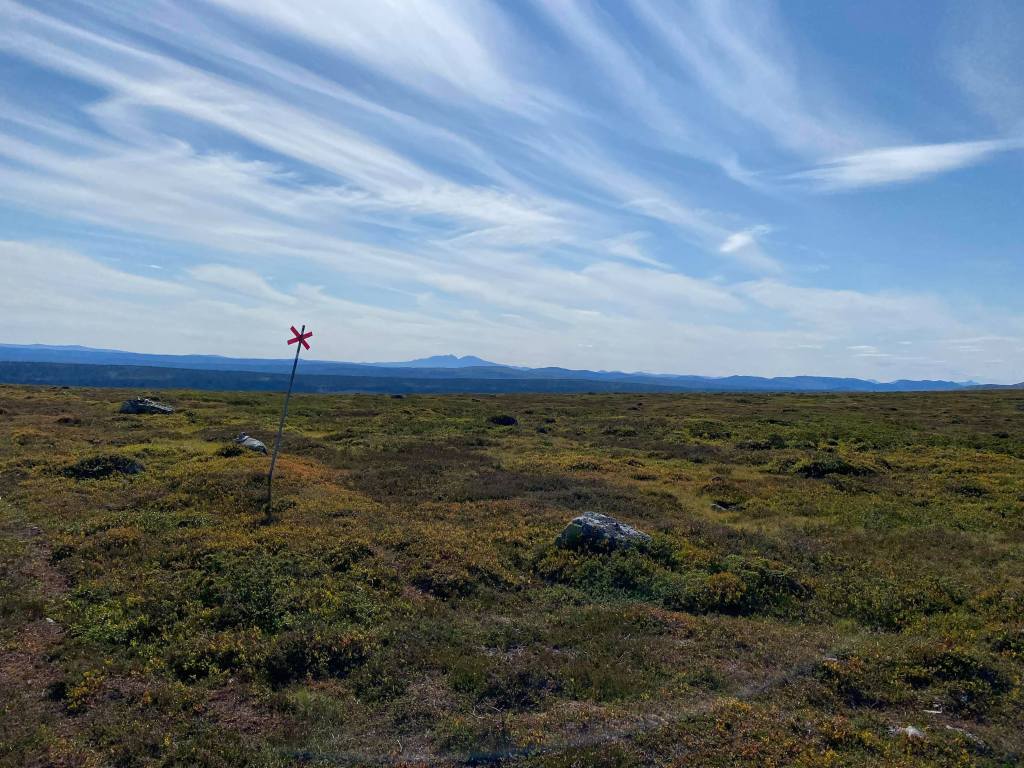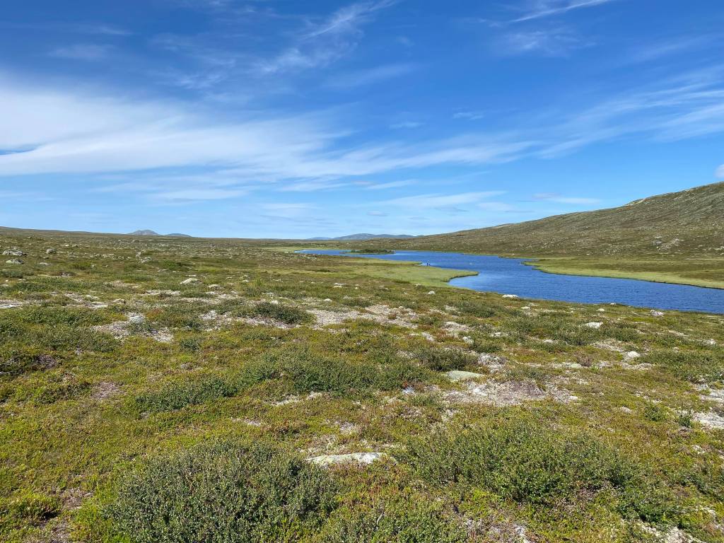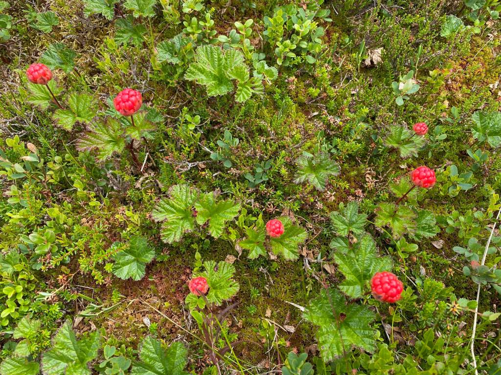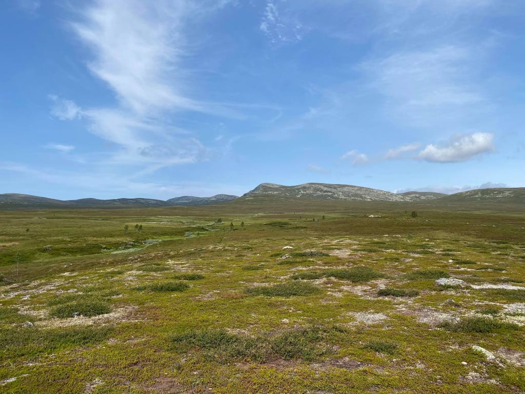 Nu närmar vi oss Närfjällsstugan. Du ser den en bit längre fram till vänster. Där vilade vi, åt vår matsäck och gick på dass. Härligt med vila och påfyllning av energi. Hjortron såg vi också men de var inte riktigt mogna.