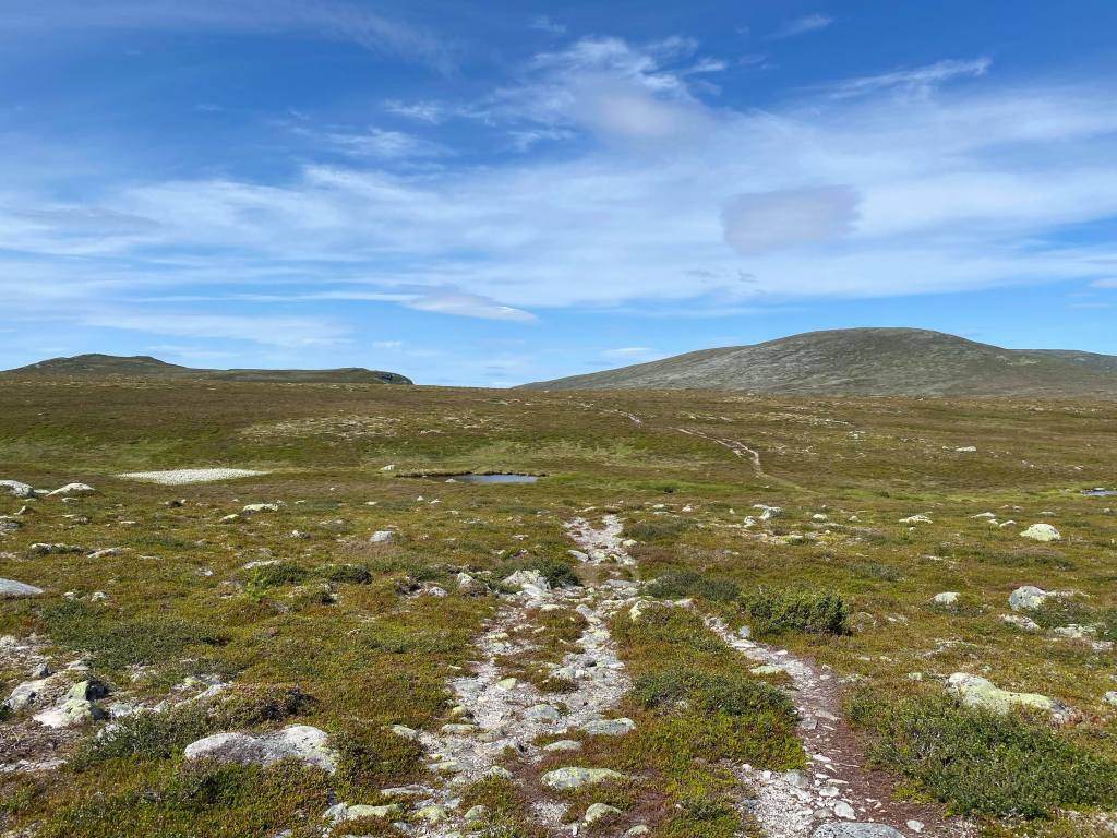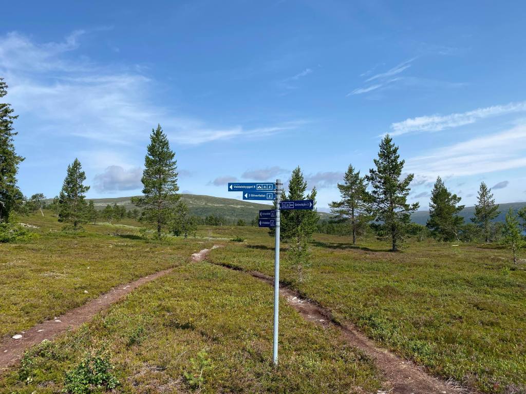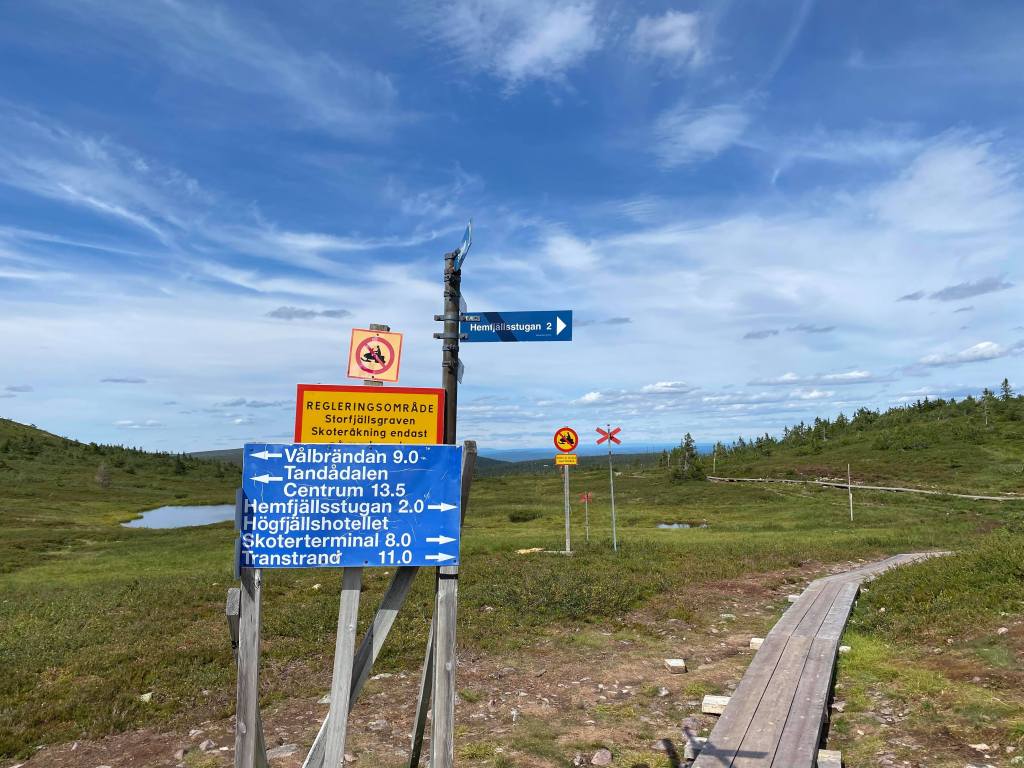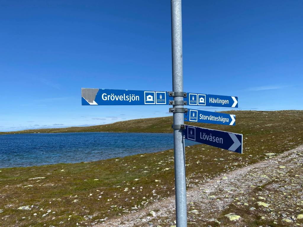 Vi började vid Lövåsgårdens Fjällhotell som är vårt hem för några dagar. I början var det väl skyltat vilken väg vi skulle gå. När man kommer högre upp finns det bra markeringar. Sommartid ska man välja sommarstigarna för annars kanske man blir tvungen att vada. Vi träffade några som hade fått göra det och det var inte särskilt trevligt. Vattnet var iskallt och strömmade häftigt så det var jobbigt för dem. Sommarstigarna på våra karta var rosaprickiga. Vi är glada att vi kände till detta.