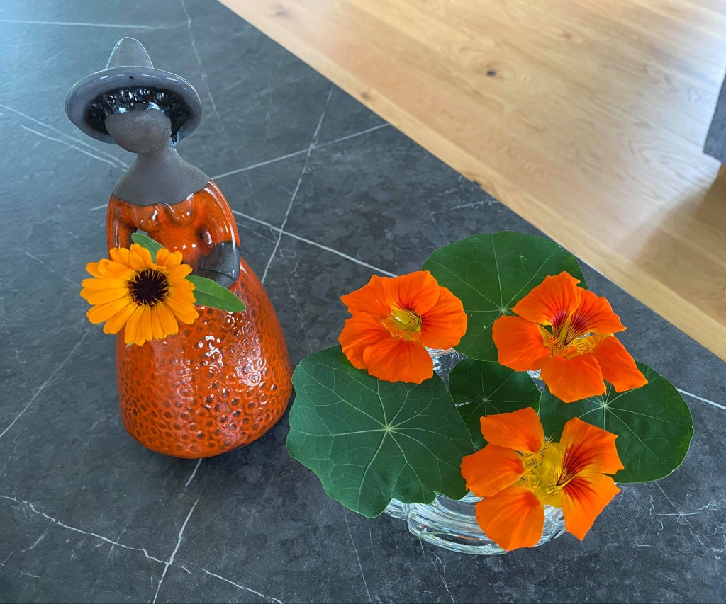 Jag har också pyntat inne och kombinerat krassen med en figurin av Elsie Bourelius som har en färsk ringblomma i händerna. Vackert!