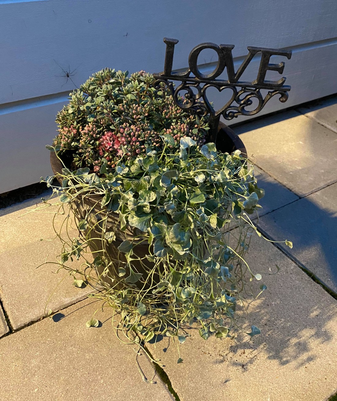 Jag fick se en jättefin låg kärleksört när jag besökte en handelsträdgård. Jag slog till och köpte både den och en silvernjurvinda. Nu har jag planterat dem och de är så vackra ihop. Det är roligt med växter.