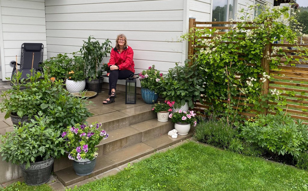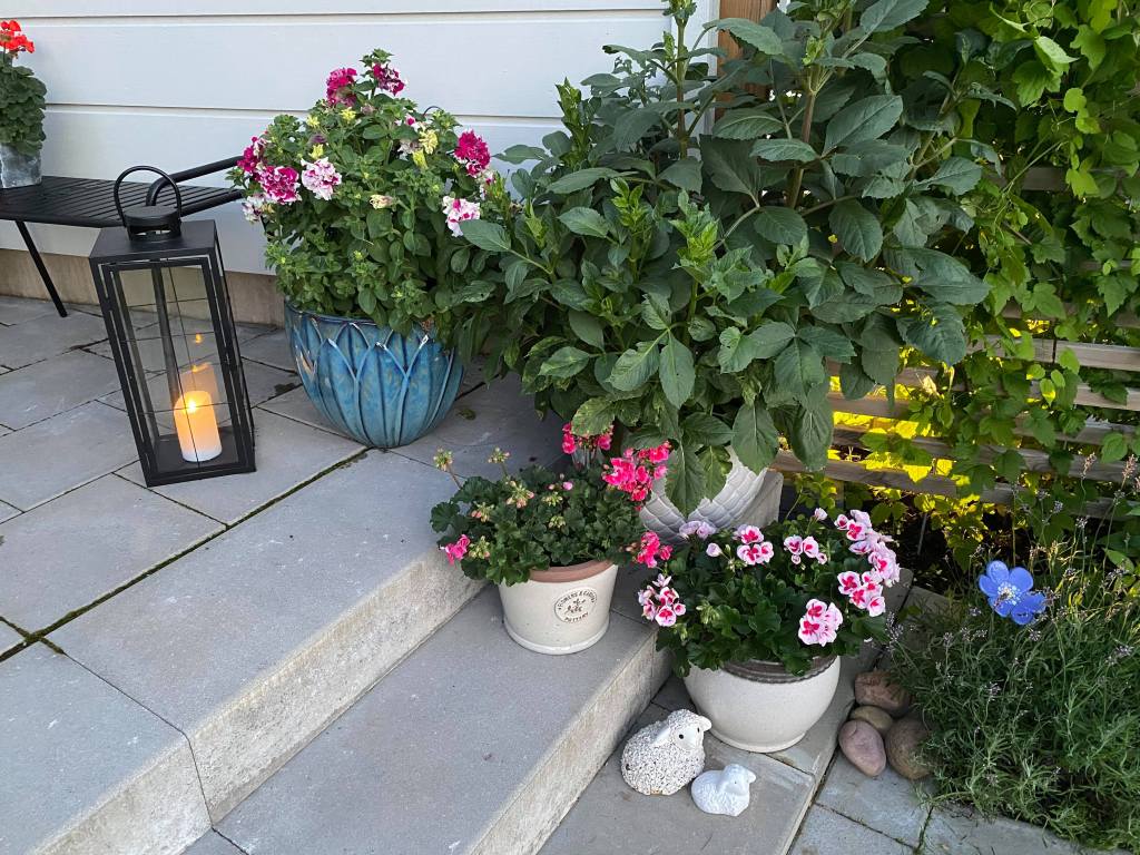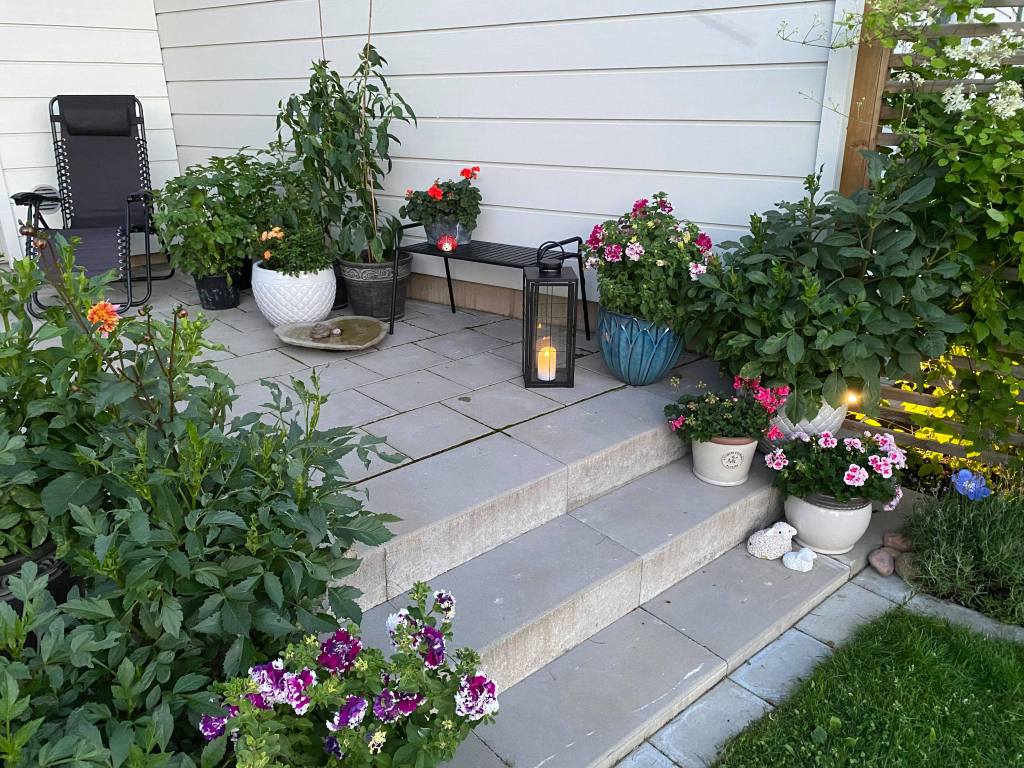 På fem minuter hade hon skapat något helt nytt av mina växter. Det blev jättefint. Efter att vi köpt en bänk och en lykta har jag nu en helt underbar liten oas. Jag trodde att vi bara skulle ha nöje när de kom hit men det blev sannerligen både nytta och nöje i en salig blandning. Superroligt och inspirerande är det att ha dem här! ![]()