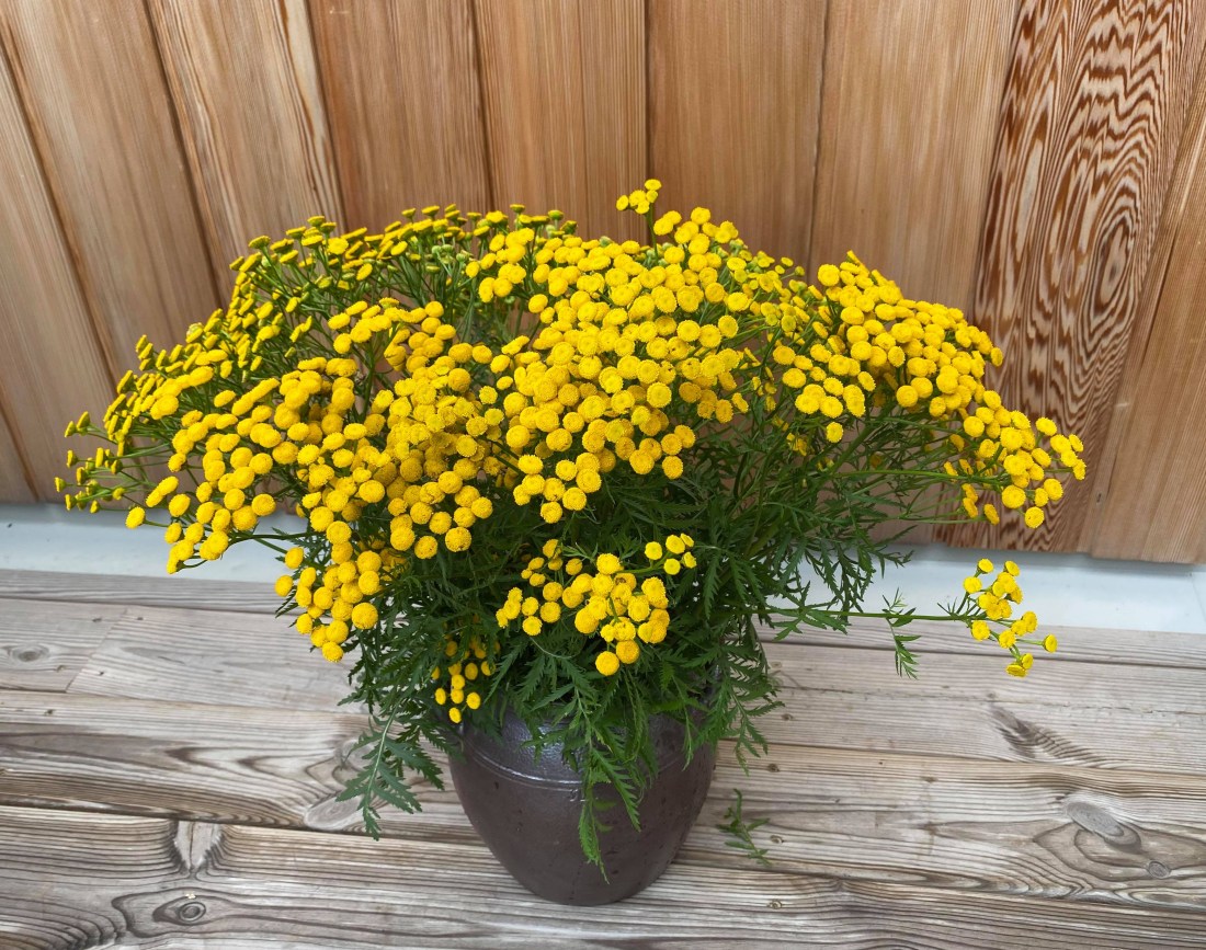 Det växer mycket renfana utanför huset. Jag tycker den är vacker där den står men nu har jag också plockat en bukett och placerat på balkongen. Jag tycker det är jättefint med den gula färgen mot cederträet.