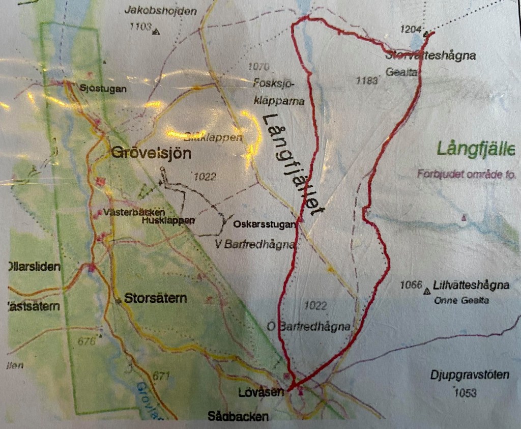 Wow, vilken häftig dag! Vi har bestigit Storvätteshågna som är Svealands högsta berg, 1 204 m. ö.h. Vi startade kl 09.10 och kom hem kl 17.10. Det tog alltså 8 timmar. Om du har någorlunda god kondition vill jag verkligen rekommendera dig att göra denna vandring. Vi var riktigt trötta i fötterna när vi kom hem men oj, vilken härlig upplevelse! En del vandrar upp och ner samma väg men vi tyckte det var trevligt att gå en annan väg ner. Vi följde den röda markeringen nedan.