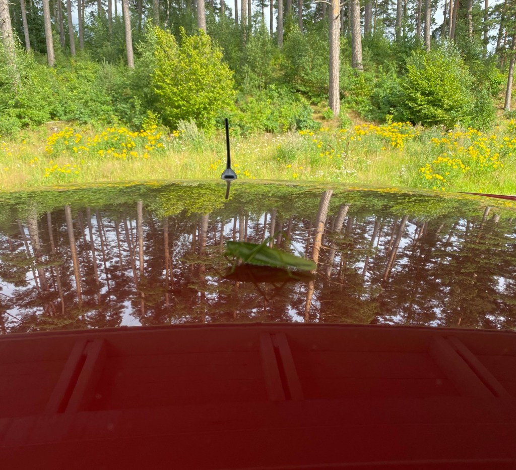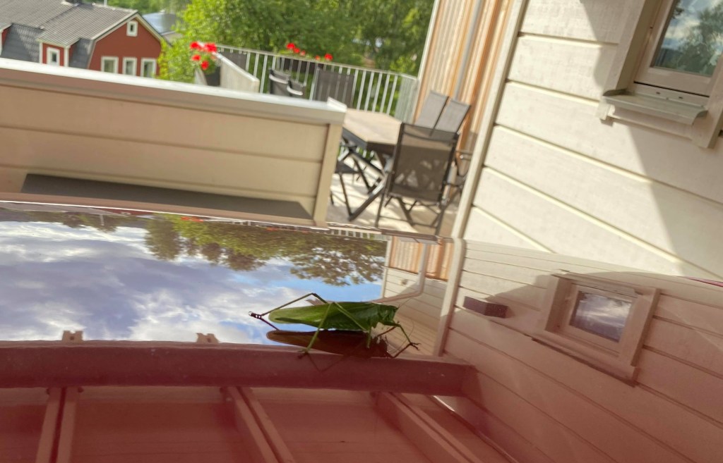 När jag kom ut till bilen och skulle köra fick jag se en stor gräshoppa på biltaket. Den satt kvar och hoppade inte iväg när jag började packa in det som skulle med. Den var så stor och fin att jag ville fotografera. Jag hoppade upp och ner och ställde mig i olika vinklar för att fotografera och gräshoppan satt kvar.