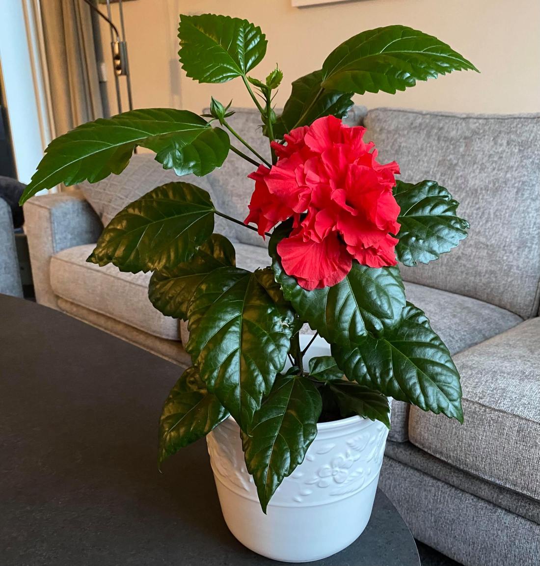 Det kommer fler knoppar och jag ska verkligen försöka sköta den omsorgsfullt. Detta är en dubbelhibiskus. Blommor ger glädje.