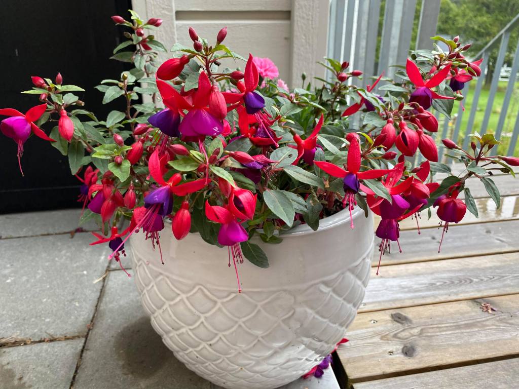 Jag år så glad att jag köpte denna underbara fuchsia den 22 maj. Den har blommat hela sommaren och jag älskar dess starka färger. Den har stått på balkongen och glatt mig. Blommor ger liv och glädje både ute och inne. Det blir mycket blommor i bloggen nu men jag älskar mina färgstarka blomster.