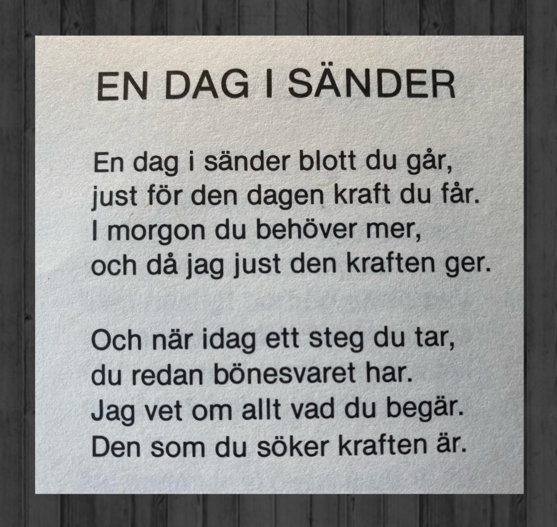 En dag i sänder blott du går, just för den dagen kraft du får. I morgon du behöver mer, och då jag just den kraften ger.