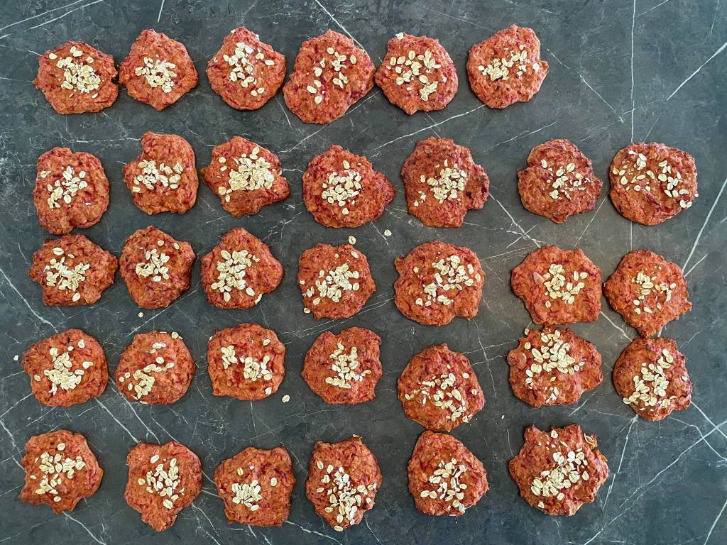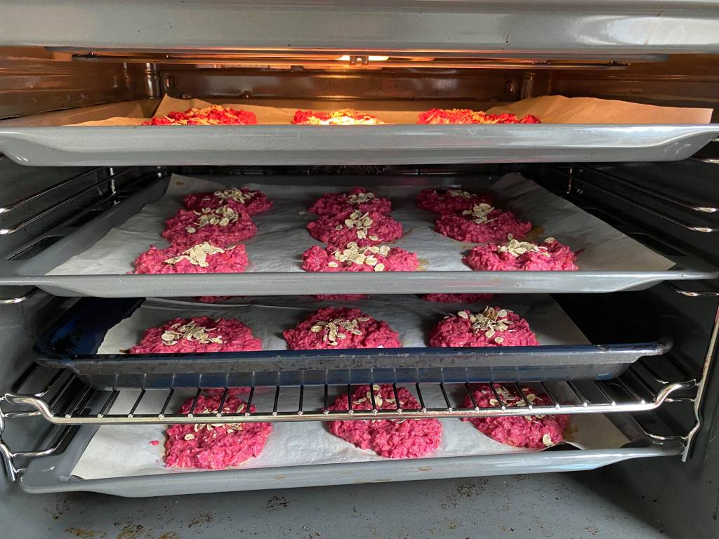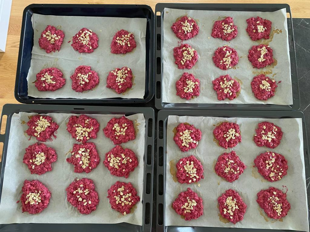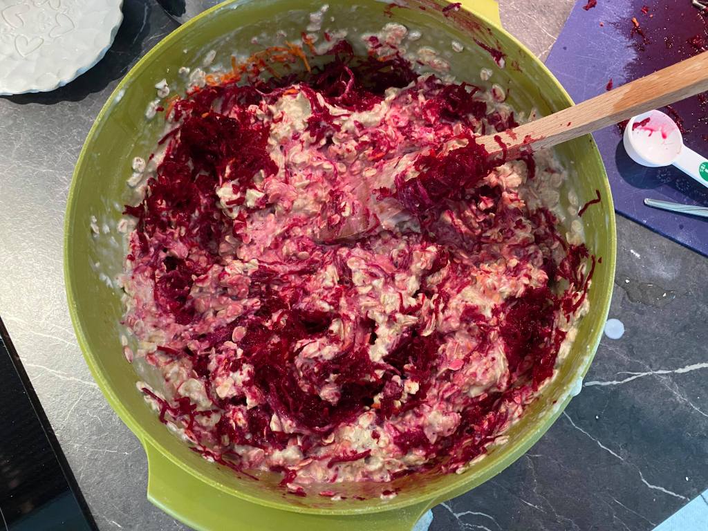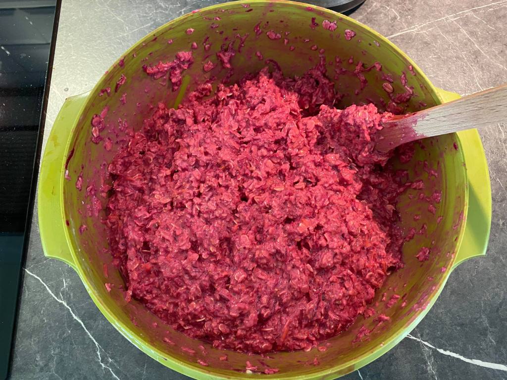 Varje sats ger 8 brödbitar och jag brukar göra 4 satser så att har jag bröd för drygt en vecka. Ofta brukar jag blanda i ett rivet äpple per sats men idag tog jag rödbetor istället och en morot. Kolla vilken härlig färg det blev och rödbetor är ju så nyttigt.