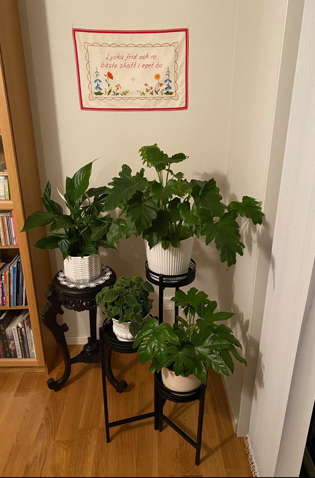 Jag har letat efter en blomhylla för att skapa en växthörna men har inte hittat något lämpligt i de butiker jag besökt. Häromdagen sökte jag på nätet och fick se denna svarta blomställning i tre våningar. Jag gillade den direkt och beställde den. Idag har den kommit och jag har fixat i ordning mina relativt nyinköpta växter som tål att stå i skugga och alltså inte behöver så mycket ljus. Jag satte också dit den gamla piedestalen som kommer från min mormor och morfars hem. Jag tycker det blev bra. Nu återstår bara belysning av något slag samt en doftpelargon. Min mormor hade flera doftpelargoner. Hon sa att de renar luften så nu vill jag också ha denna växt bland de andra luftrenande växterna. Får se hur jag ska placera den…i en ampel kanske?