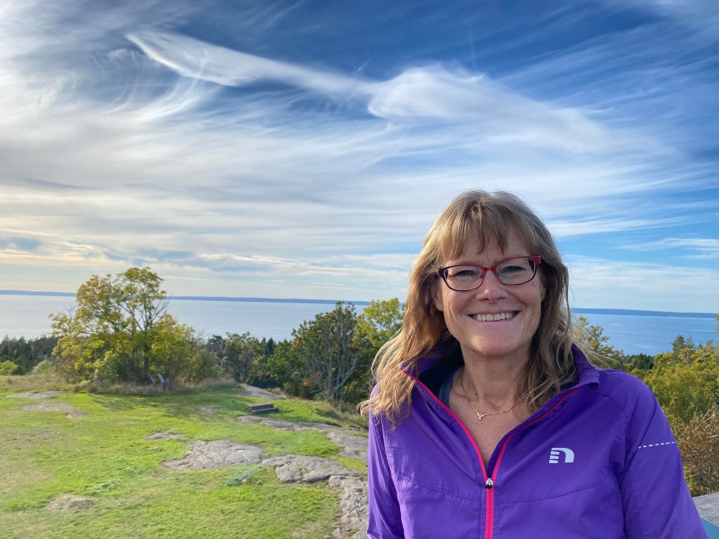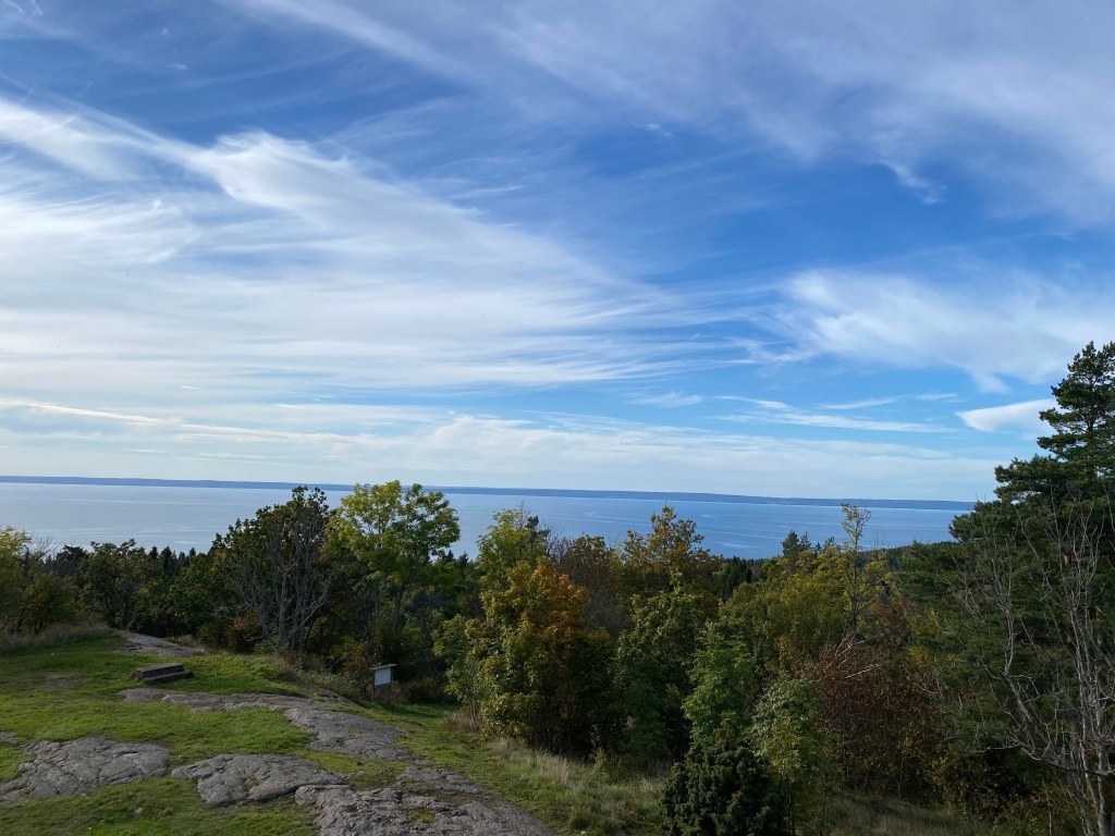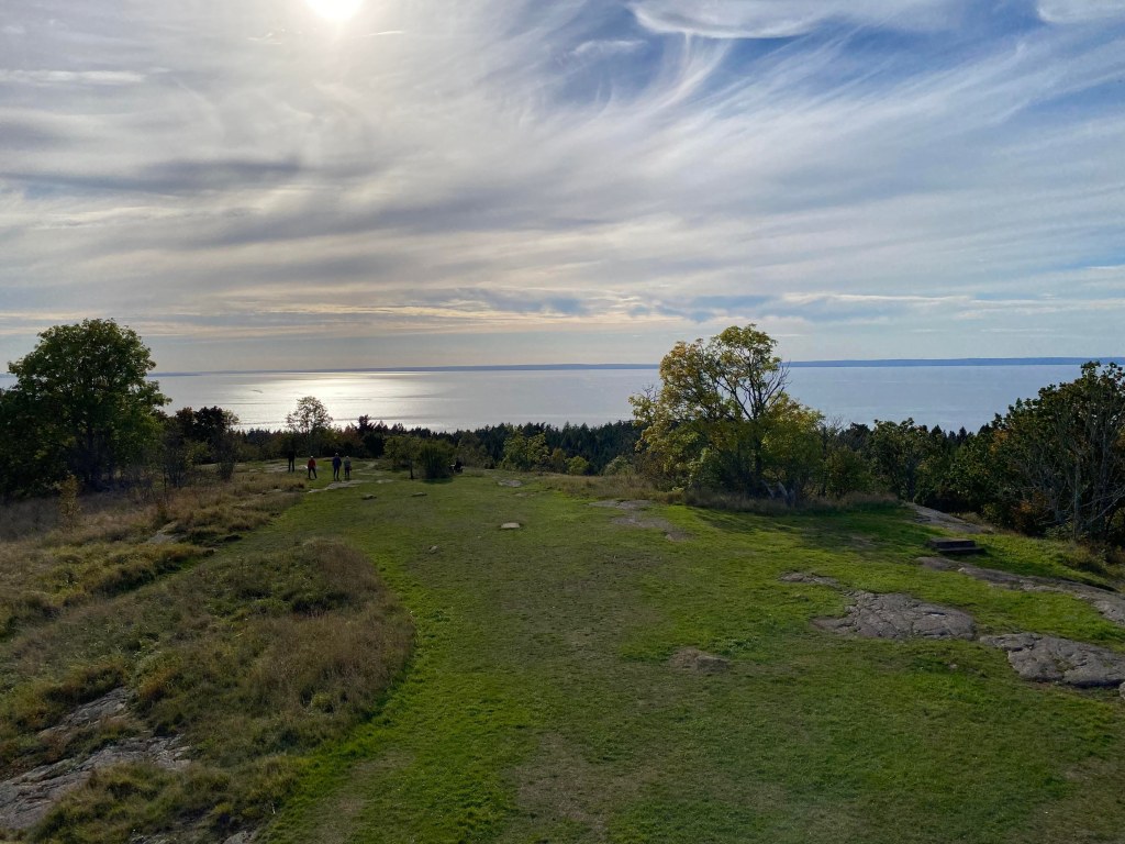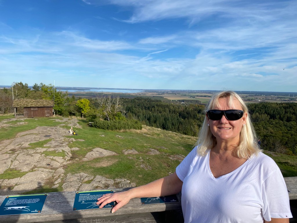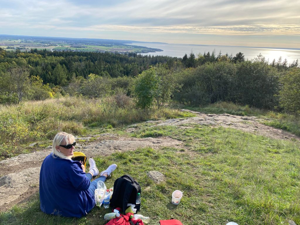 Nu är vi uppe på toppen Hjässan där utsikten är fantastisk. Man ser åt alla håll. Hjässan når 262,8 meter över havet och 174,7 meter över Vättern.