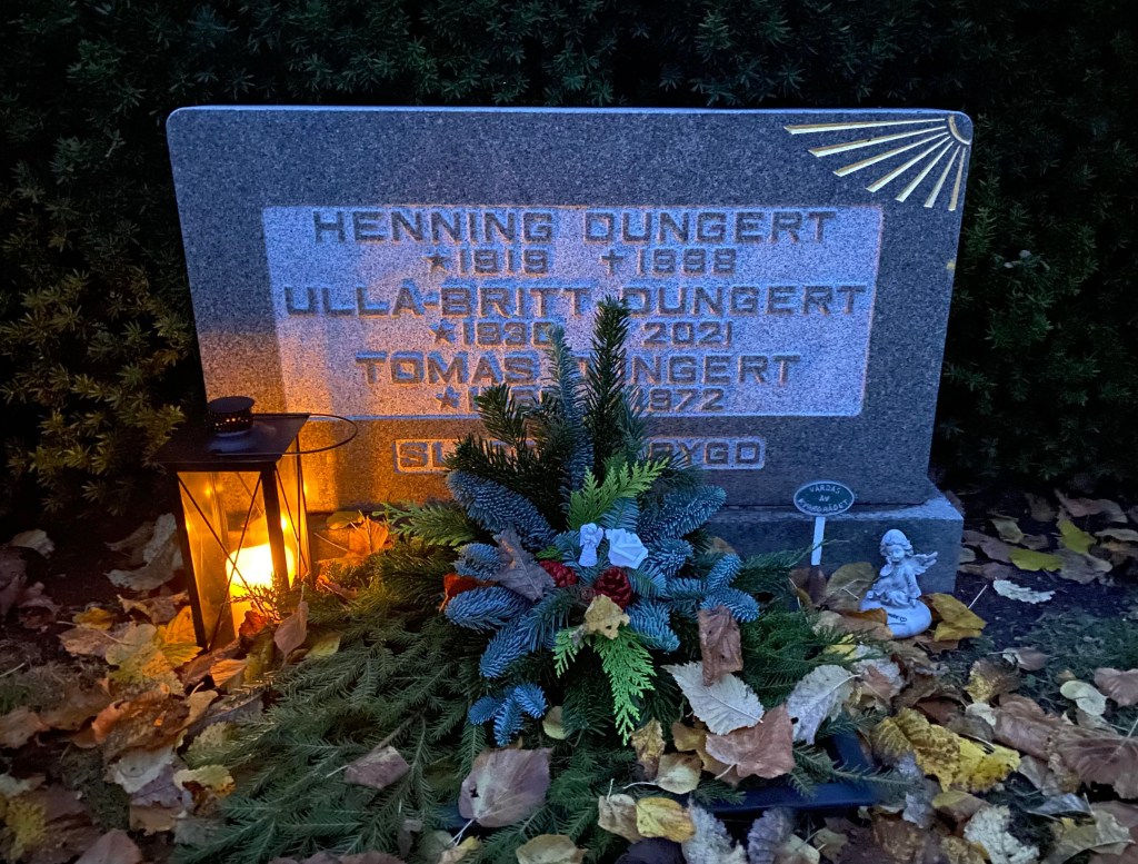 Vi tittade också till gravarna. Det är så vackert med alla tända ljus överallt. Fint att få se pappa, mamma och Tomas grav i mörkret med det tända ljuset.