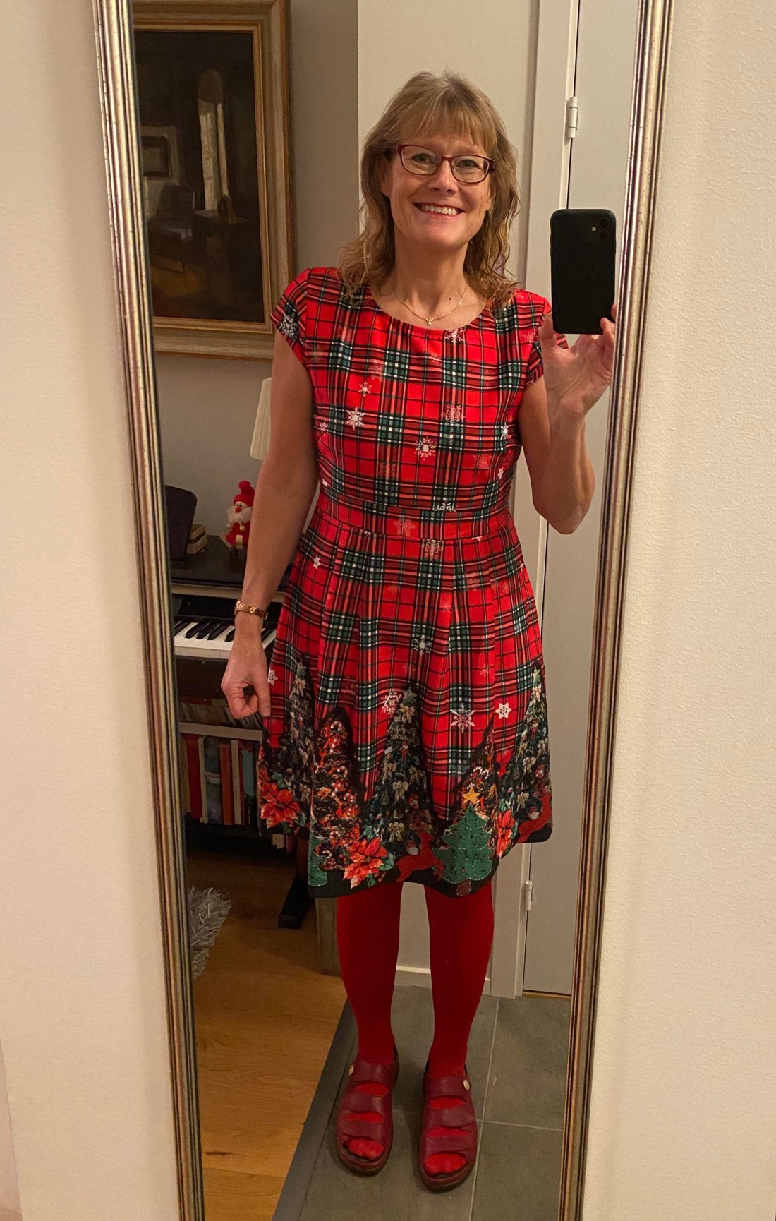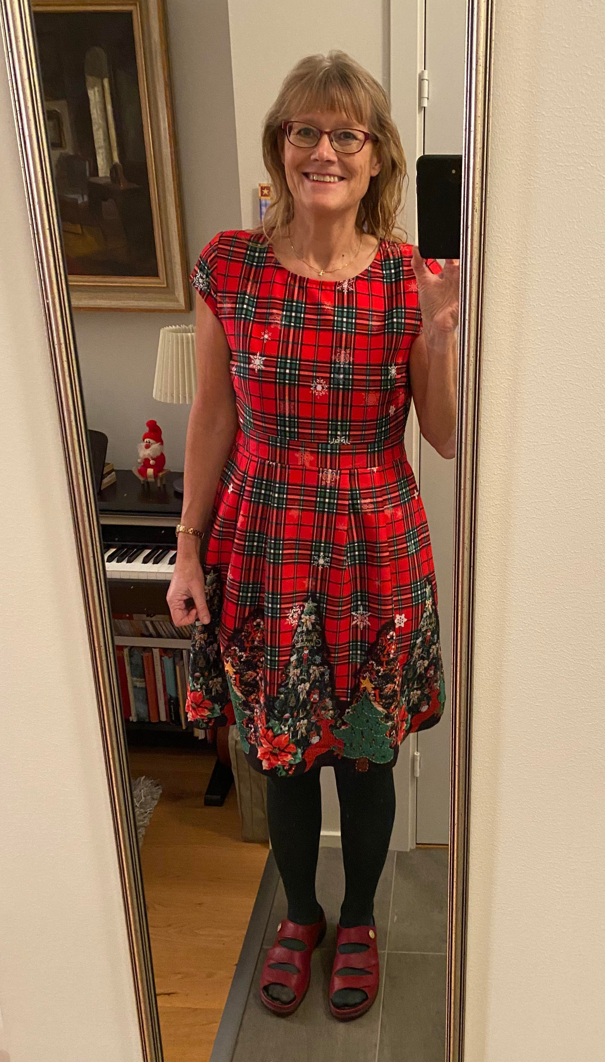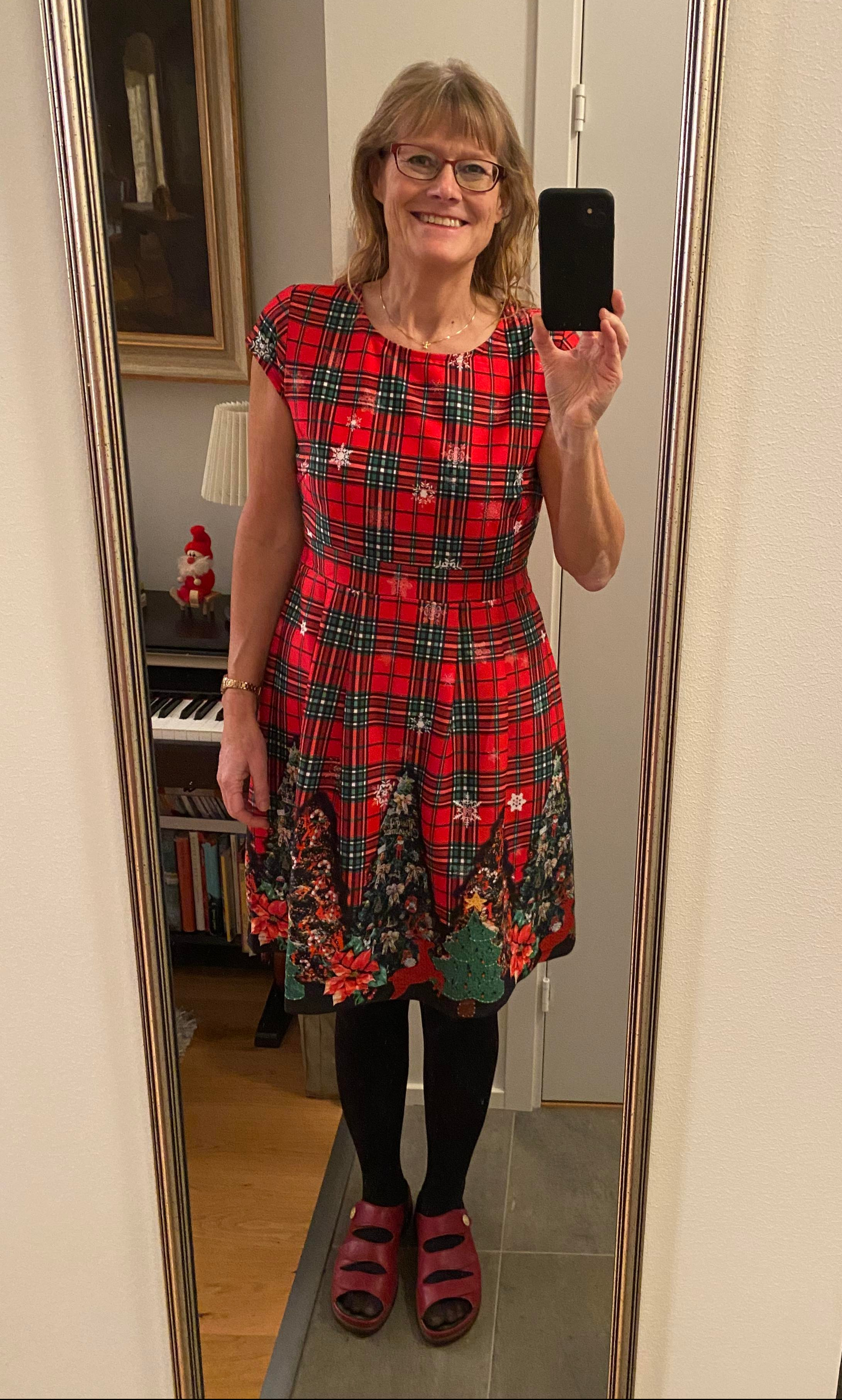 Jag har köpt mig en julklänning som jag tycker är riktigt kul. Ikväll har jag invigt den då jag varit på adventsmingel hos en god vän. Frågan är vad som är snyggast att använda till klänningen: röda tights, gröna tights eller svarta tights. Ikväll tog jag de röda. Det piggar upp med glada färger.
