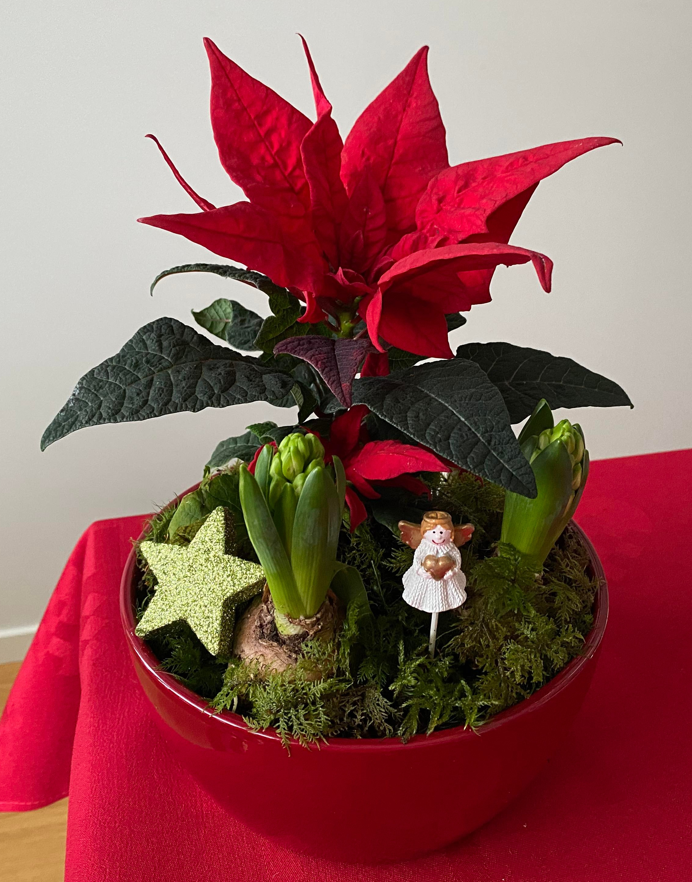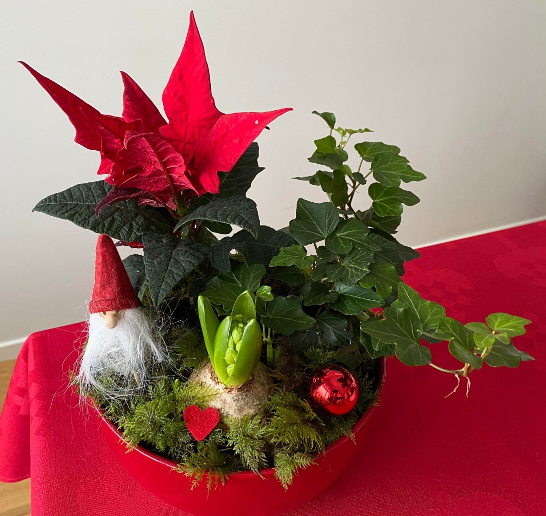 Jag älskar att göra julgrupper och har nu gjort några stycken i advent. De två senaste gav jag bort, en till hjälpsamma grannar och en till en kompis som jag besökte. Har man tur står de fina länge och hyacinterna är ju bara att byta ut när de vissnat. På så vis kan julgruppen skänka glädje till långt in i januari eller t o m längre. Det är både vackert, stämningsfullt och mysigt tycker jag.