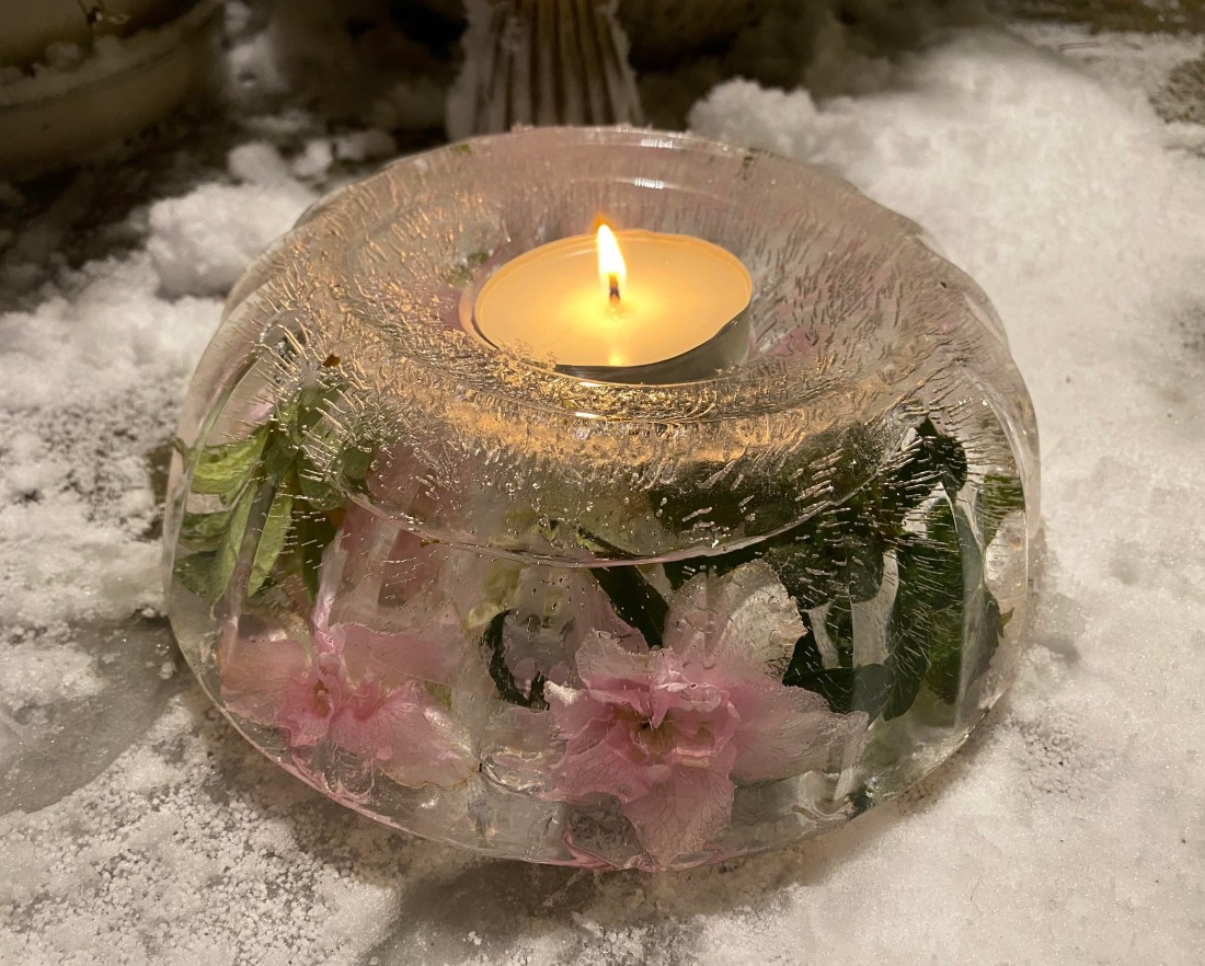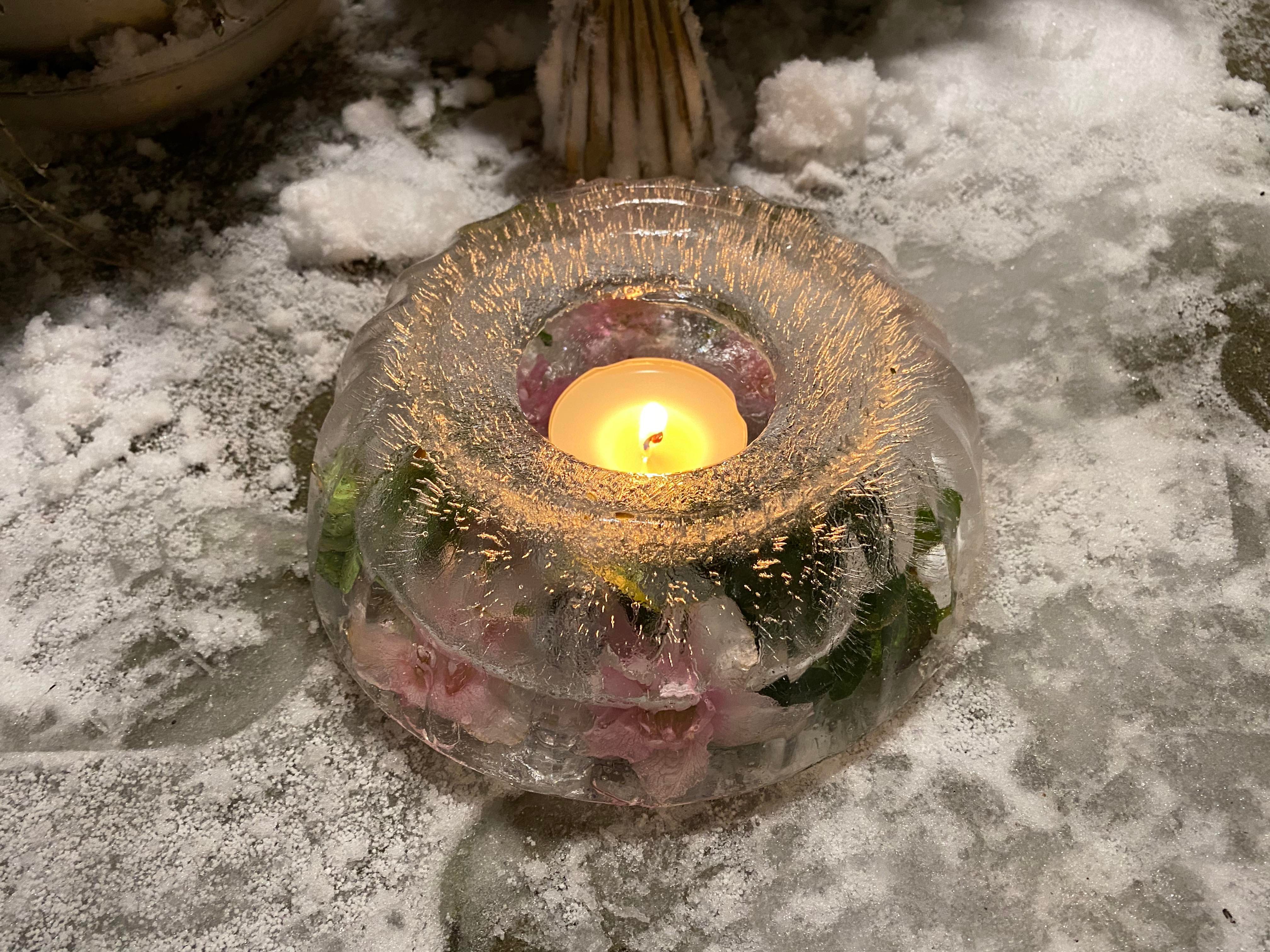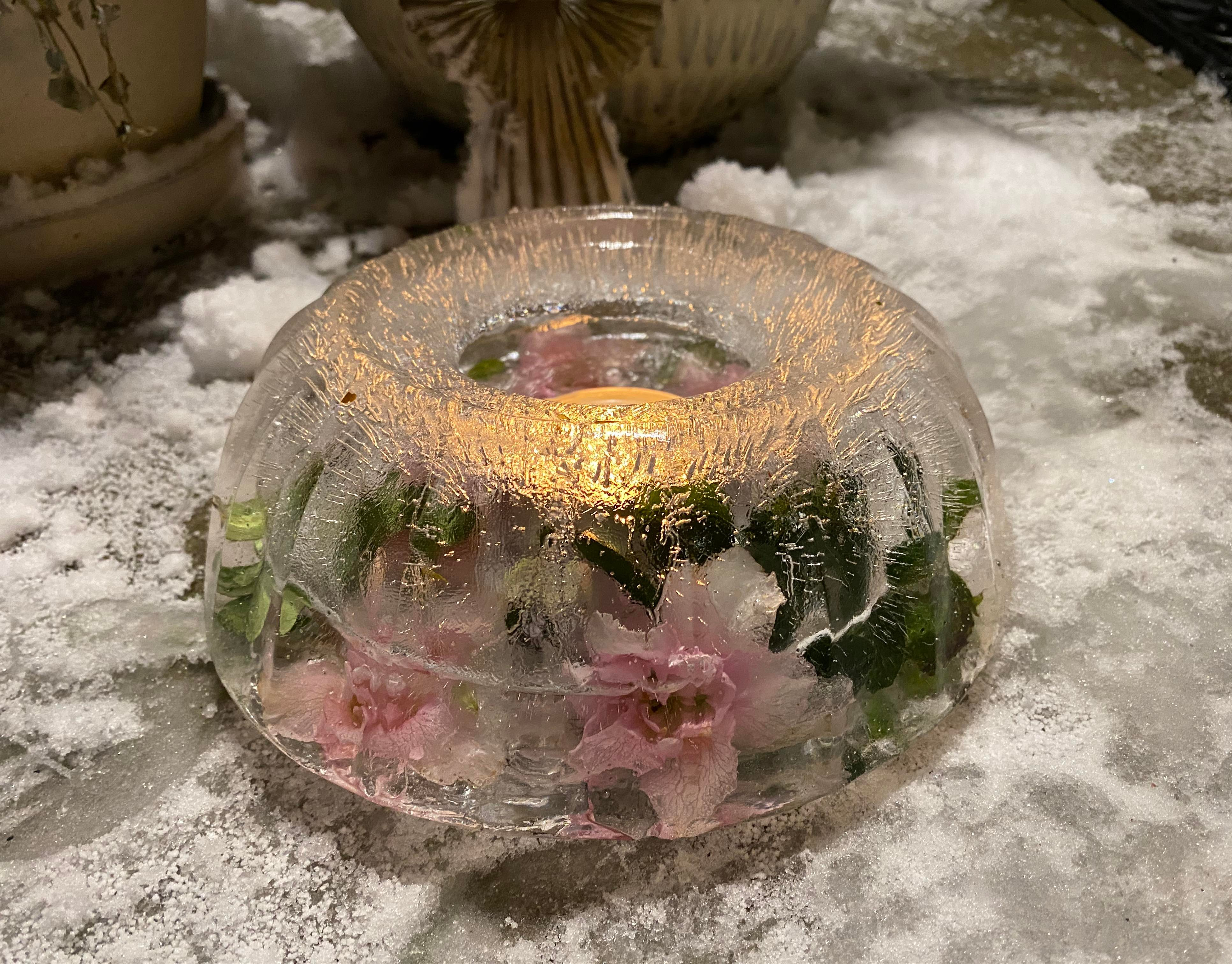 Idag har jag gjort en islykta. Jag fick se att en gammal klasskompis från Lärarhögskoletiden hade lagt upp några islyktor på Facebook och jag tyckte de var så fina. Det var både lätt och roligt. Jag hade velat ha rosor egentligen men i brist på det nöp jag av några blommor och blad från min azalea. Jag lade dem i en sockerkaksform och hällde på vatten. Jag ställde in det i frysen på morgonen. Ikväll skulle jag ha gäster kl 18.00 så strax innan tog jag ut det ur frysen. Det var inte riktigt genomfrusen utan det rann lite vatten inuti lyktan men det gjorde inte så mycket. Jag satte ett stort värmeljus i och placerade det vid entrén. Om jag får säga det själv så tycker jag att resultatet blev ljuvligt. Mina gäster tyckte sammalunda.