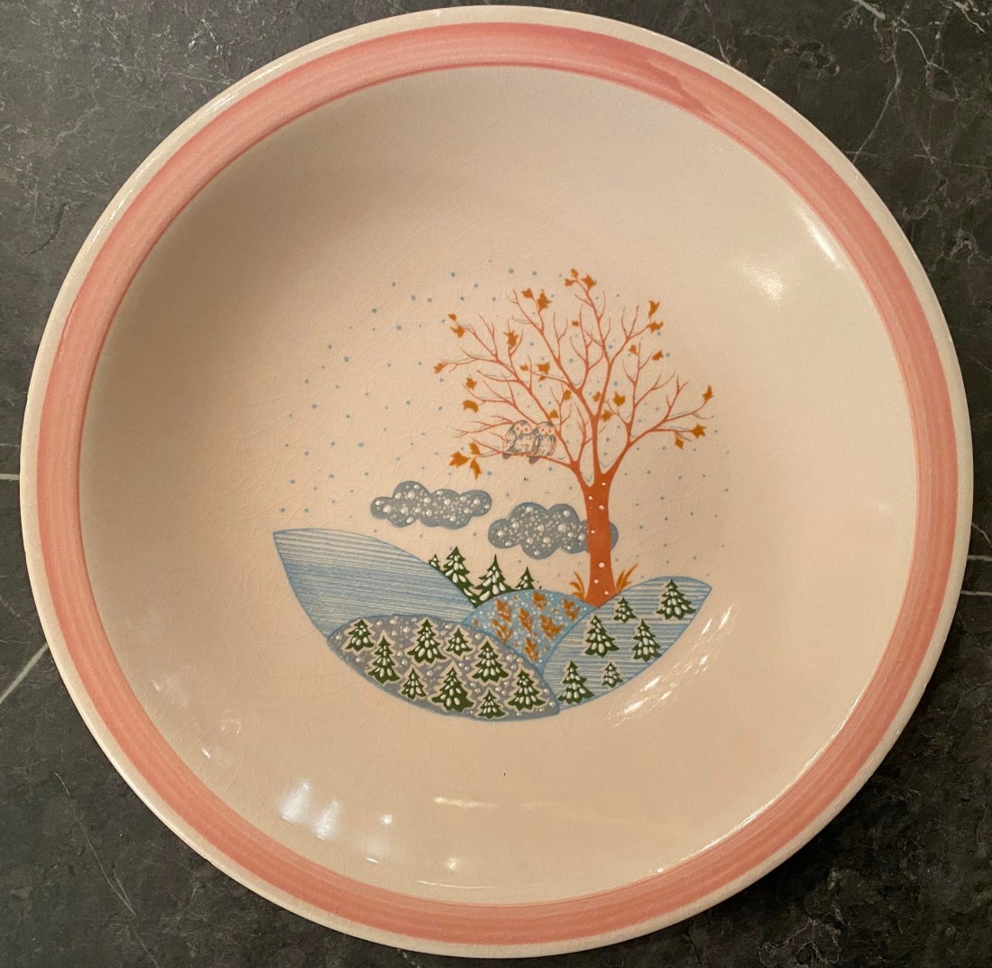 År 1988 bodde jag i Frankrike och då köpte jag en servis som heter L’hiver rose. Det är franska och betyder Rosa vinter. Jag tyckte den var så fin och jag har använt den som vardagsservis under många år. Om jag inte minns helt fel köpte jag 12 mattallrikar, 12 djupa tallrikar och 12 assietter. De var inte så dyra och troligen inte av bästa kvalitet heller men de var fina och jag älskade dem. Endast två djupa tallrikar är kvar och jag äter ur dem med glädje.