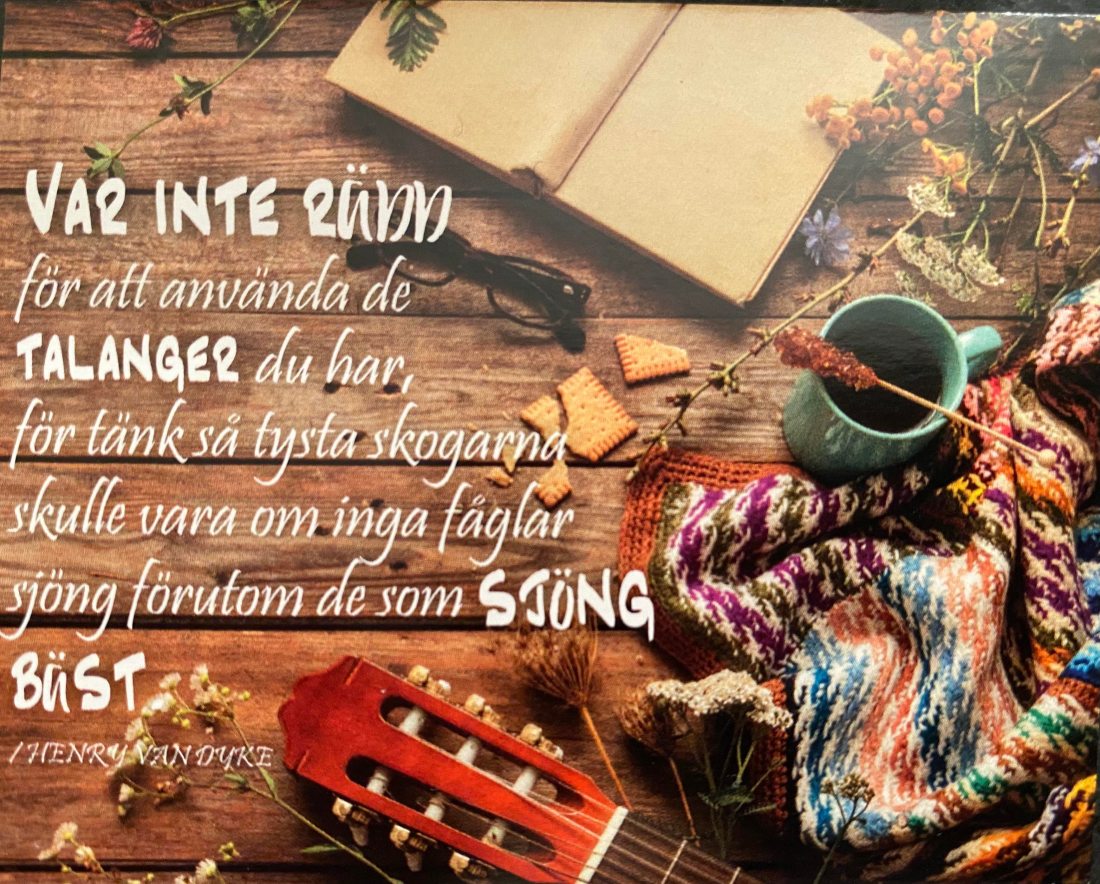 Var inte rädd för att använda de talanger du har, för tänk så tysta skogarna skulle vara om inga fåglar sjöng förutom de som sjöng bäst./Henry Van Dyke