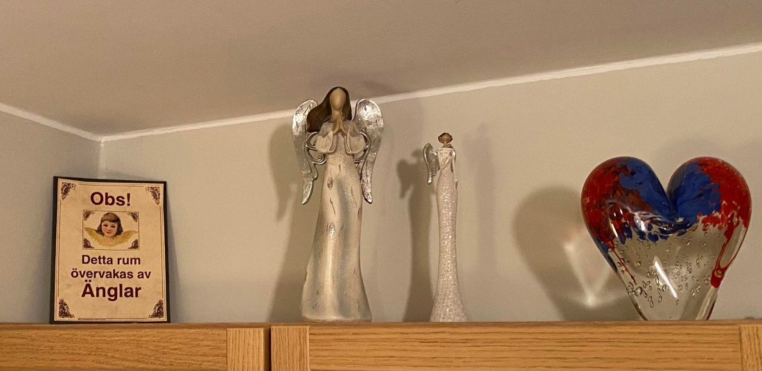 Denna hörna finns i mitt sovrum. Jag tycker det är ett ljuvligt budskap att ha i mitt hem. Här sover jag gott med både änglafigurer och de verkliga skyddsänglarna runtomkring mig. Ja, inte bara sovrummet övervakas av änglar, hela mitt hem övervakas av änglar. Det är skönt att veta.
