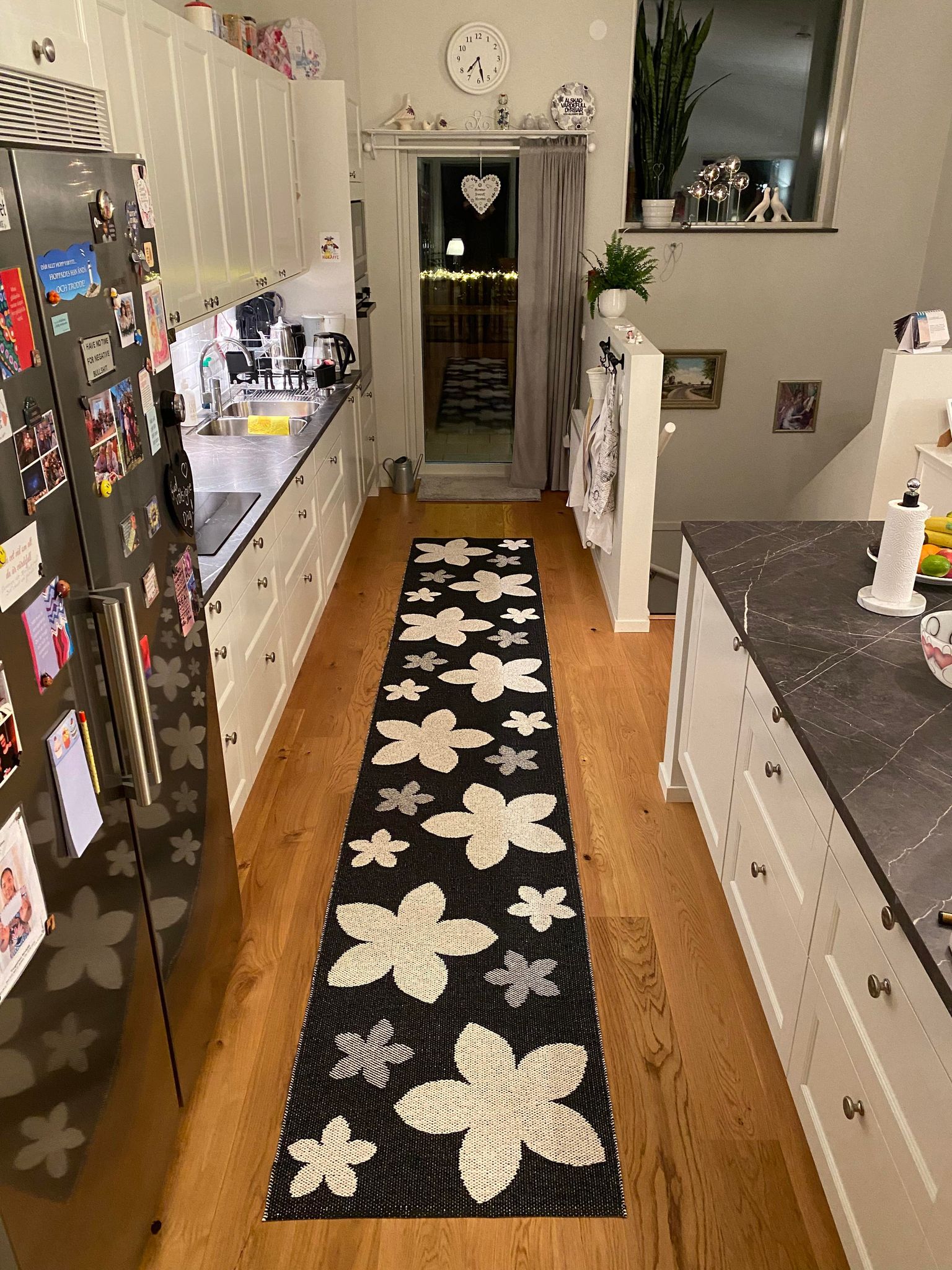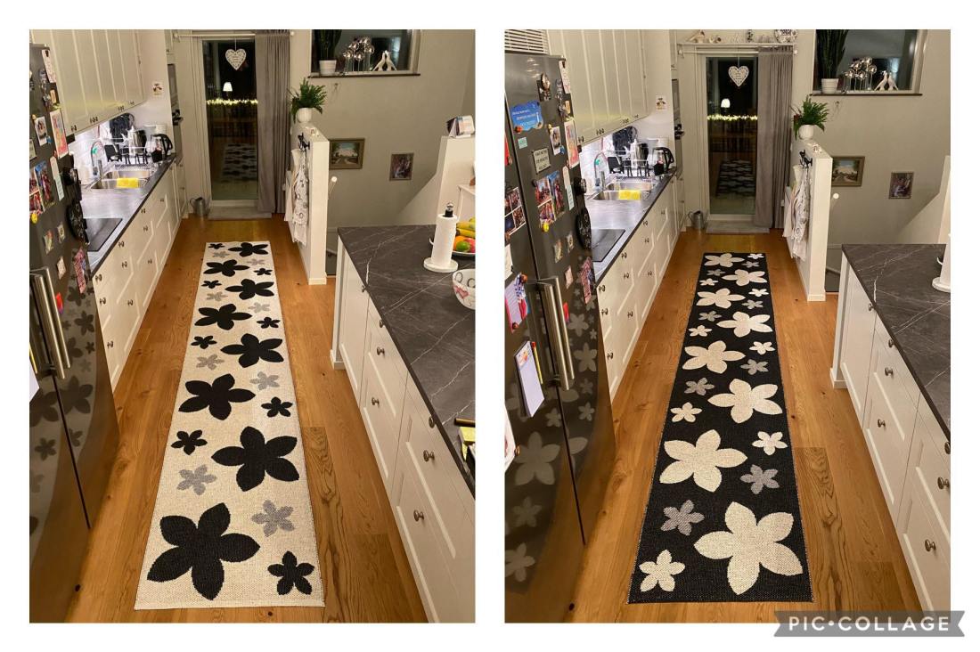 Nu är den på plats och jag är så nöjd. Denna matta gör mig glad. Man kan ha den på båda sidorna vilket är toppen. På så sätt får jag två mattor. Nu är frågan, vilket blir snyggast i köket, vit eller svart botten? Vad tycker du? Kommentera om du vill!